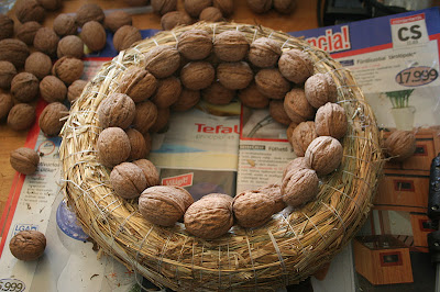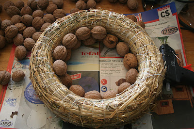 A múltkori dióvásárlás után kiderült, hogy ebben az adagban nagy számban vannak aránylag kis méretű diók, ezekre sajnáltam a megpucolási energiát, úgyhogy gondoltam, kiváló alapanyagot fognak képezni a karácsony környéki dekorációk megalkotásához. De persze ezzel sem tudtam várni... úgyhogy előkotortam a garázsból egy szalmakoszorút, beizzítottam a ragasztópisztolyomat, és nekiláttam, hogy felhasználjam az aprócska diókat.