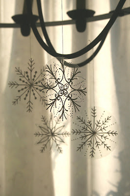 Gondoltam, otthon is szívesen alkalmaznám a hópelyheket dekorációnak - de valami igazán könnyed és légies, a hópehely lényegéhez illő megvalósítást szerettem volna. Aztán a múltkor a papírjaim közül előbukkantak az írásvetítős fóliáim, és gondoltam, ez kiváló alap lenne, mivel könnyű, átlátszó és vékony. Már csak az volt a kérdés, mivel kerüljenek rá a hópehelyminták... tavaly üvegmatrica-kontúrral festettem hópelyheket, de a minták nem lettek így elég könnyedek. És ekkor eszembe jutott a mostanában annyira imádott lakkfilcem - és rögtön tudtam, ez lesz a tökéletes megoldás. :-)