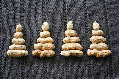 Múltkor éppen a földimogyorókat rakosgattam egy tálba, amikor a konyhapulton négy darab valahogyan egymás mellé sodródott, és én úgy rácsodálkoztam az általuk kiadott formára, hogy abbahagytam a rakosgatást, a pillanatragasztóért nyúltam, és elkészítettem a lenti dolgot - még az egyszerűbbnél is egyszerűbb, mégis mindenkinek mosolyt varázsol az arcára. Úgyhogy ha van otthon mogyorótok és pár szabad percetek, készítsétek el - persze kis izgága gyerekkezecskék közelébe nem javaslom, ennyit nem bír a ragasztó. :-)