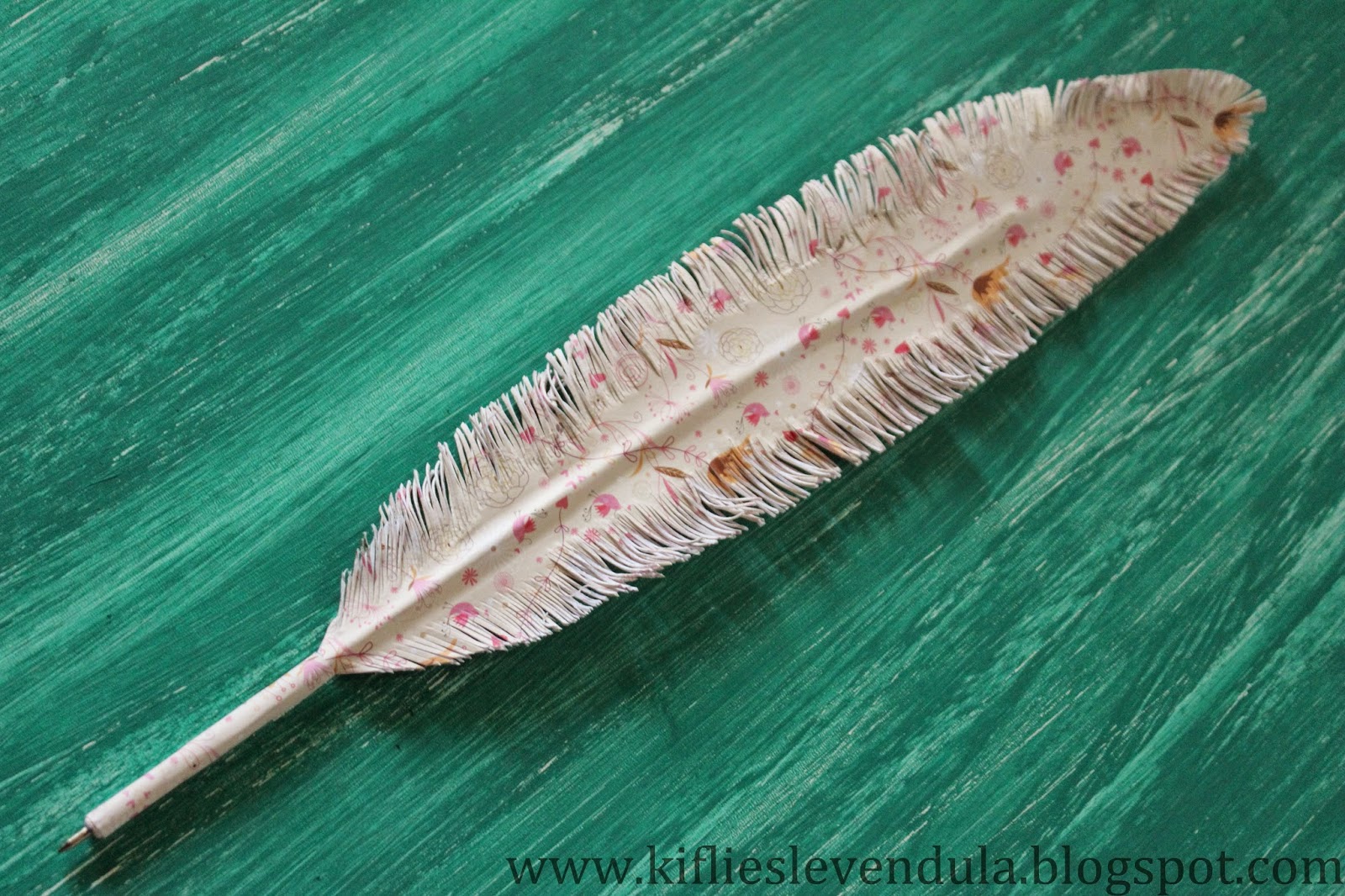 Az ötlet azonnal helyeslésre talált, és rögtön sok-sok puszit is kaptam, hogy találtam megoldást a dologra, tehát már csak ezért is megérte elkészíteni a pennát. :-) Lúdtoll helyett én a barkácspapírok közül használtam fel egyet, a Nagyobbikhoz illően kedves mintásat - és persze első lépésként kivettem egy golyóstollból a tollbetétet.
