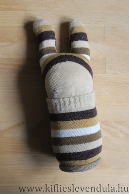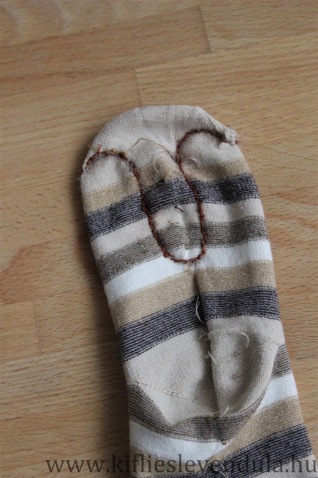 Az első lépés kellemesen egyszerű: ki kell fordítani a zoknit. A sarokrész lesz a nyuszi pofija, ezért úgy igazítsuk el a zoknit, hogy ez kerüljön középre.