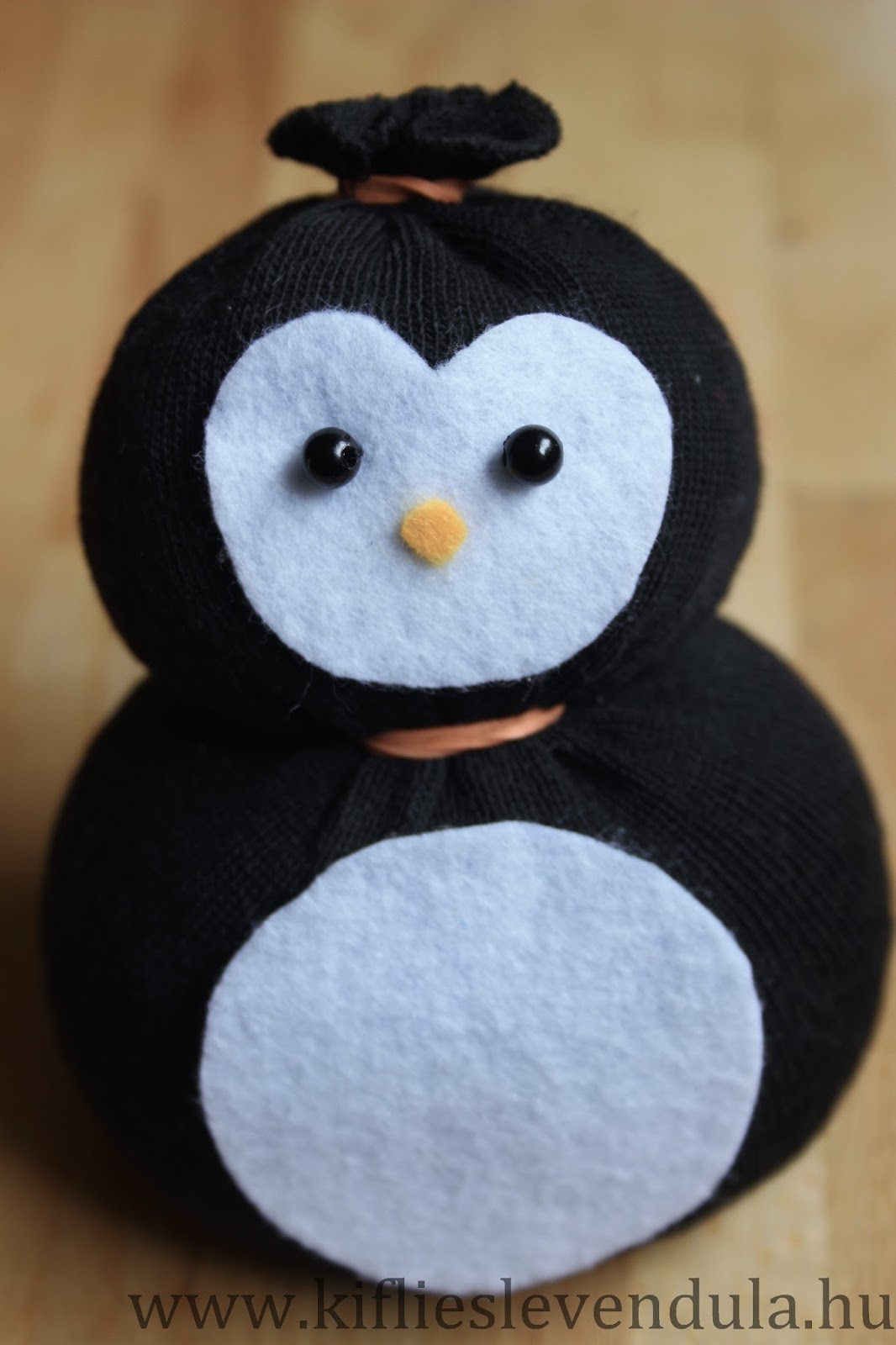 Készítsük el a másik zoknipingvint is, majd egy szalagot kössünk közös sálként a nyakukba, és végül fekete filcanyagból vágjunk és ragasszunk egy-egy szárnyat a figurák oldalára.