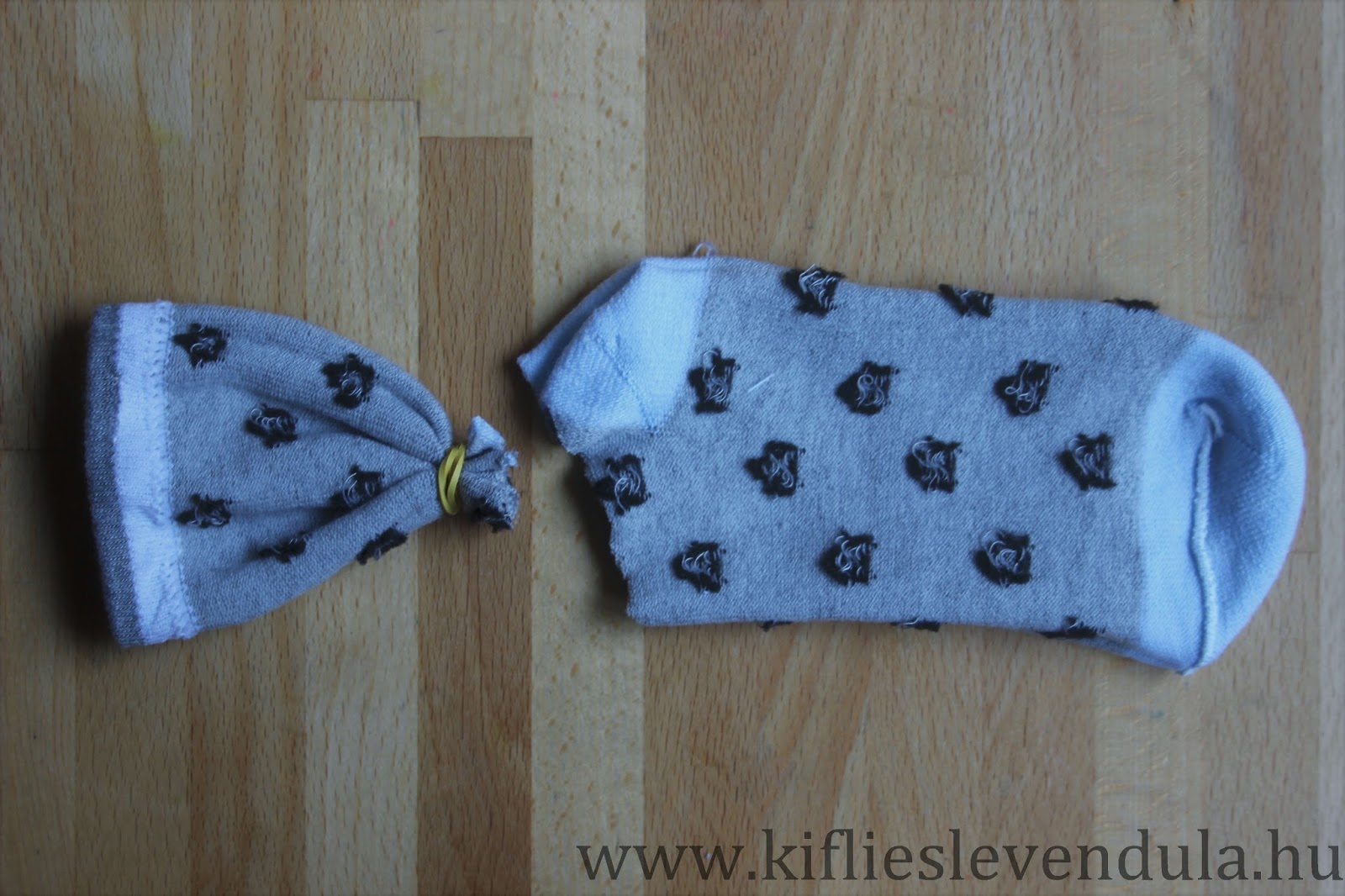 A másik, mintás zoknit fordítsuk ki, vágjuk el a sarokrész fölött, és kössük egy gumival: