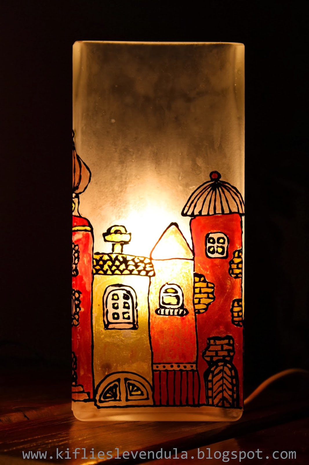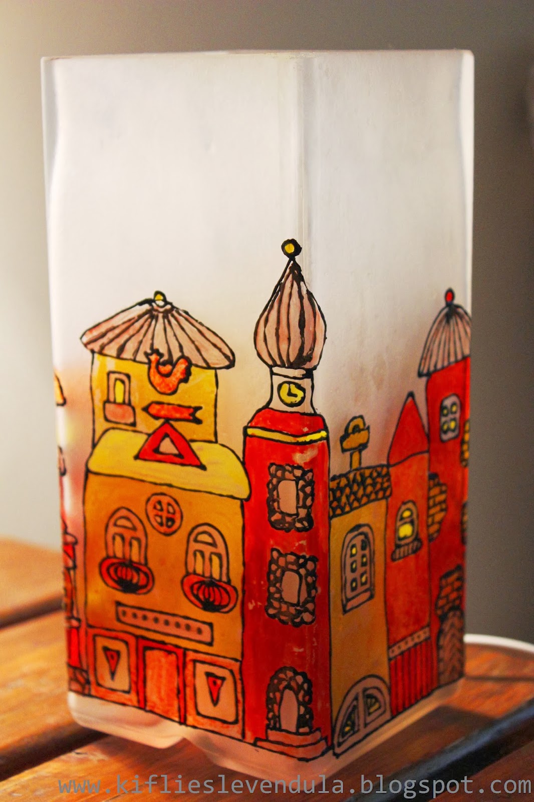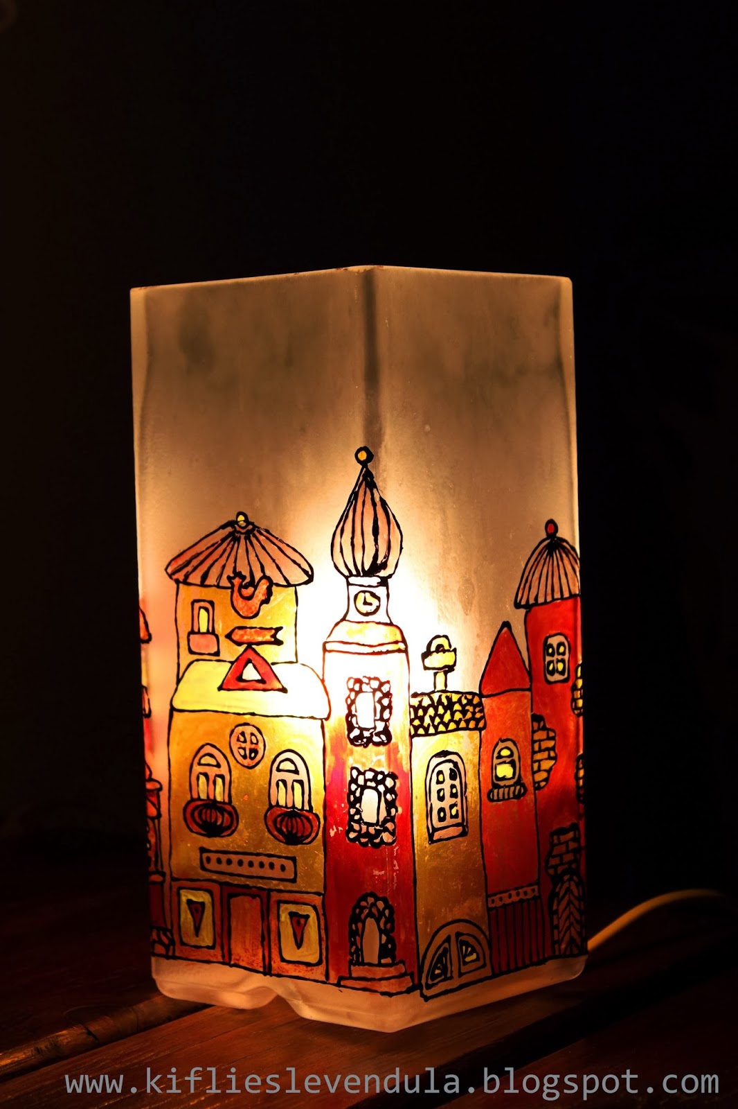 A mai bejegyzés egy ajándékról szól, amit Móni barátnőmnek készítettem, sok-sok-sok szeretettel :-). Alapként egy teljesen egyszerű, hasáb formájú, tejüveg Ikea-lámpát használtam, és egy réges-régi Praktika újságból vettem a mintához az inspirációt. A tervem az volt, hogy üvegfestékkel fogom megfesteni a lámpát, de végiggondolva a dolgot rájöttem, hogy ez túl sok időt igényelne, hiszen a négy oldal teljesen külön kellene megfesteni, hogy ne folyjon meg a festék, viszont a száradással napokat kellett volna várni. Így aztán a sokkal gyorsabb és biztonságosabb üvegmatrica-festék mellett döntöttem - egy szétvágott nagy műanyag irattartó dossziéra nagyjából felmértem a lámpaoldalakat, megrajzoltam a kontúrokat, és száradás után kitöltöttem festékkel. Bár így is sok időbe telt, mégis biztonságosabb és gyorsabb megoldás volt, mint a rendes üvegfesték... Száradás után nagyon óvatosan lehúztam a minta egy részét a műanyag felületről, és a lámpára nyomogattam, az egyik saroknál kezdve. Nagy üvegmatricás mintáknál fontos, hogy nem szabad egyben lehúzni a matricát, hanem fokozatosan kell haladni, lépésről lépésre húzva le a mintát a műanyagról, és mindig szépen felnyomogatva a díszítendő felületre.