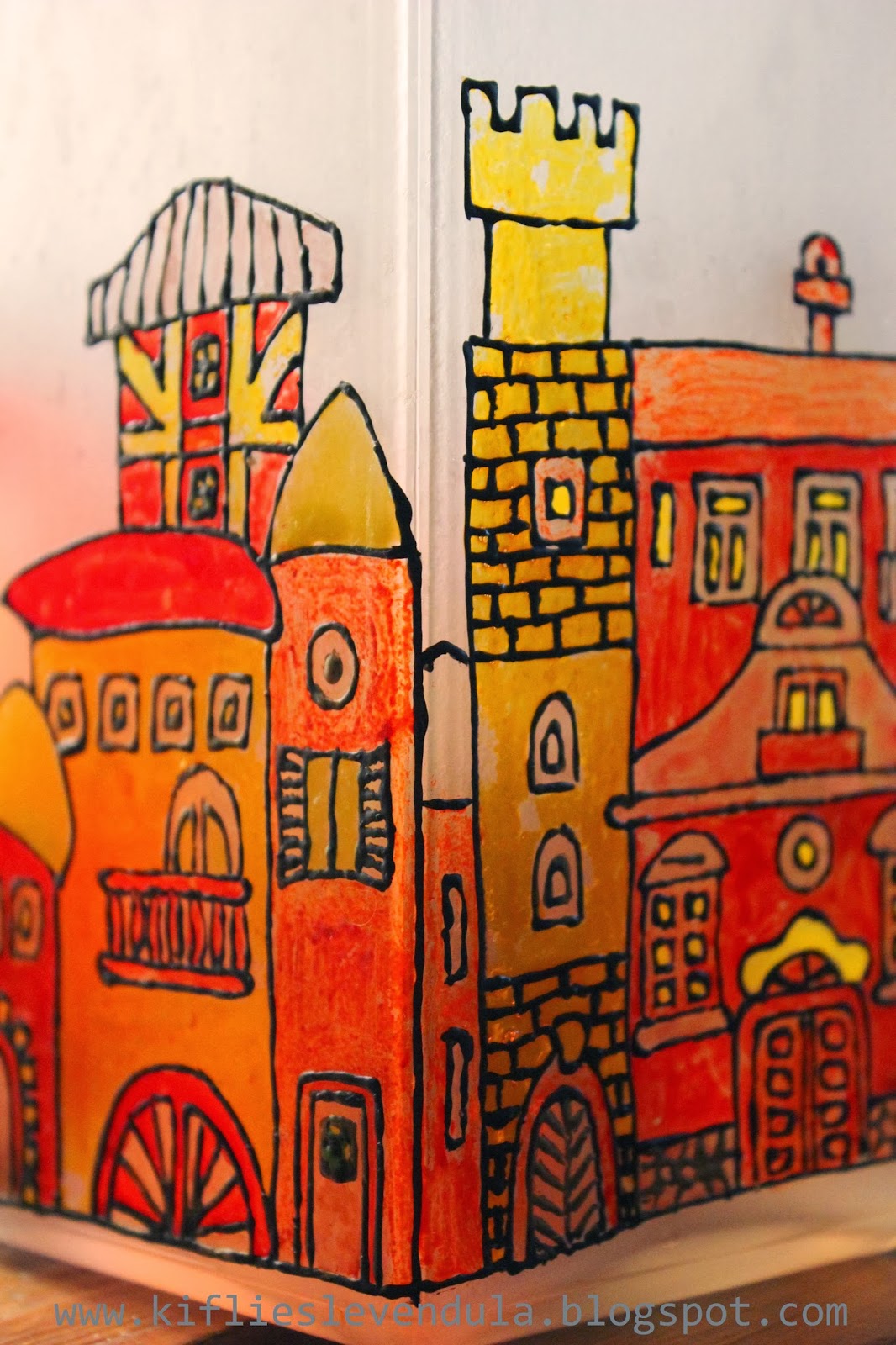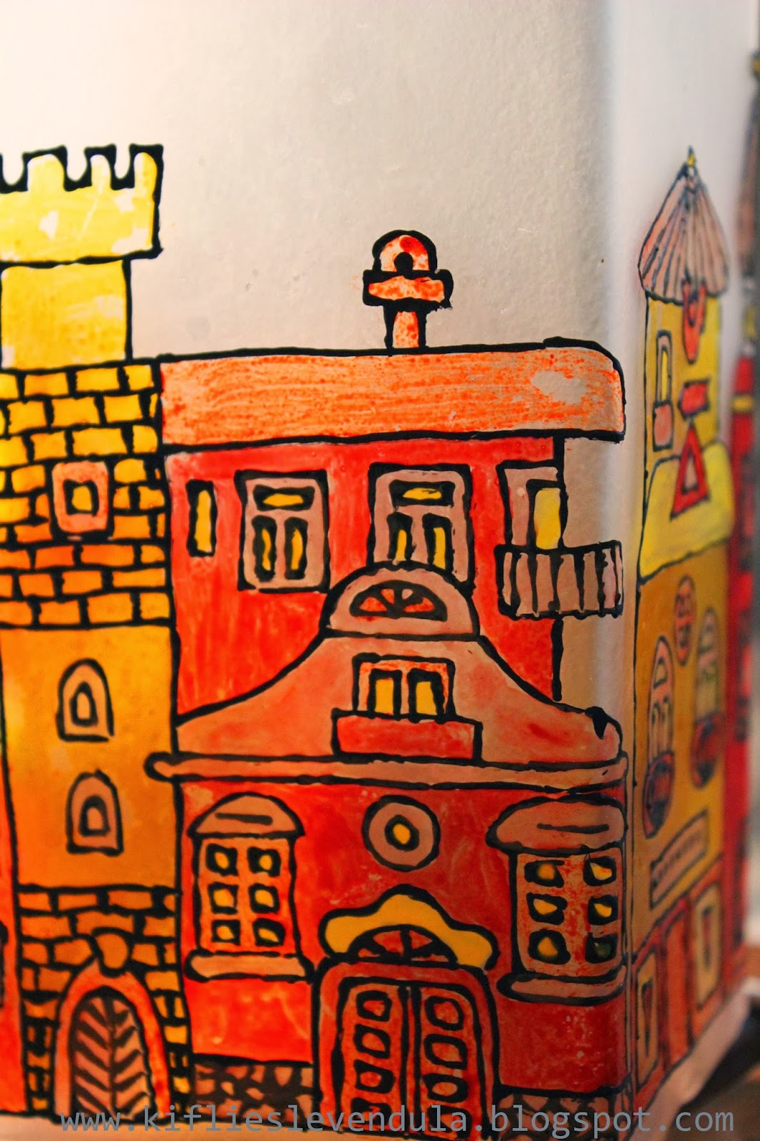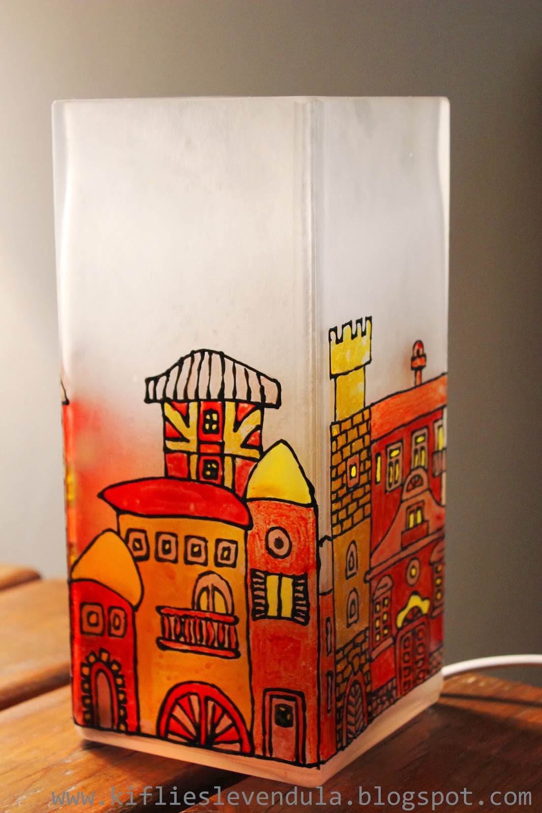 A mai bejegyzés egy ajándékról szól, amit Móni barátnőmnek készítettem, sok-sok-sok szeretettel :-). Alapként egy teljesen egyszerű, hasáb formájú, tejüveg Ikea-lámpát használtam, és egy réges-régi Praktika újságból vettem a mintához az inspirációt. A tervem az volt, hogy üvegfestékkel fogom megfesteni a lámpát, de végiggondolva a dolgot rájöttem, hogy ez túl sok időt igényelne, hiszen a négy oldal teljesen külön kellene megfesteni, hogy ne folyjon meg a festék, viszont a száradással napokat kellett volna várni. Így aztán a sokkal gyorsabb és biztonságosabb üvegmatrica-festék mellett döntöttem - egy szétvágott nagy műanyag irattartó dossziéra nagyjából felmértem a lámpaoldalakat, megrajzoltam a kontúrokat, és száradás után kitöltöttem festékkel. Bár így is sok időbe telt, mégis biztonságosabb és gyorsabb megoldás volt, mint a rendes üvegfesték... Száradás után nagyon óvatosan lehúztam a minta egy részét a műanyag felületről, és a lámpára nyomogattam, az egyik saroknál kezdve. Nagy üvegmatricás mintáknál fontos, hogy nem szabad egyben lehúzni a matricát, hanem fokozatosan kell haladni, lépésről lépésre húzva le a mintát a műanyagról, és mindig szépen felnyomogatva a díszítendő felületre.