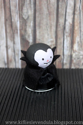 És utoljára hagytam mindannyiunk abszolút kedvencét, Drakulát: az ő fejét rögtön kétféle színűre festettük, halványlilára az arcot, feketére a hajrészt. Rendkívül csinos vámpíros köpenyt vágtam neki fekete filcből, amit a nyaknál rögzítettem - és persze a karjai is feketék lettek, zseníliadrótból.