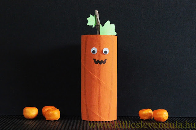 A tökfigura talán a legalapvetőbb szereplő. Az alapból is narancssárga kapszulára került papírgolyót akrilfestékkel kentük le, és fekete alkoholos filccel dekoráltuk. A szár és a karok vékony gallyacskákból készültek, a levelek zöld filcanyagból - a fejre pedig utolsó simításként grafitceruzával húztunk csíkokat.
