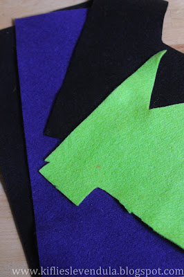 Először is kikészítettem néhány filcanyagdarabot, olyan színekben, ahogy az egy átlagos boszorkányhoz illik: