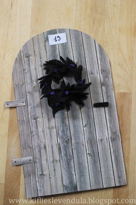 Következhetett az ajtó: ezt famintás papírból vágtam ki, amire tettem zsanérokat, kilincset, számozást (naná, hogy 13-ast), és rögtönöztem rá a maradék fekete filcanyagból egy kellően rémes ajtókoszorút.