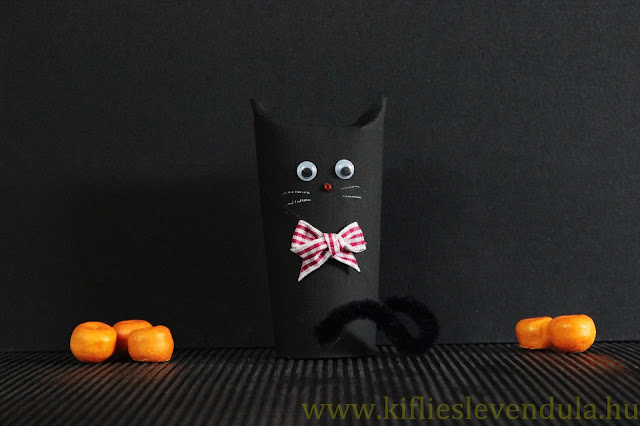 A fekete macsek elmaradhatatlan törzstagja a Halloween-brigádnak: esetünkben a feketére festett papírgolyó fej fehér papírral és akrifestékkel dekorálódott macskásra. Természetesen ragasztottunk neki farkat is fekete zseníliadrótból, és csinos masnit is kapott pékzsinegből:
