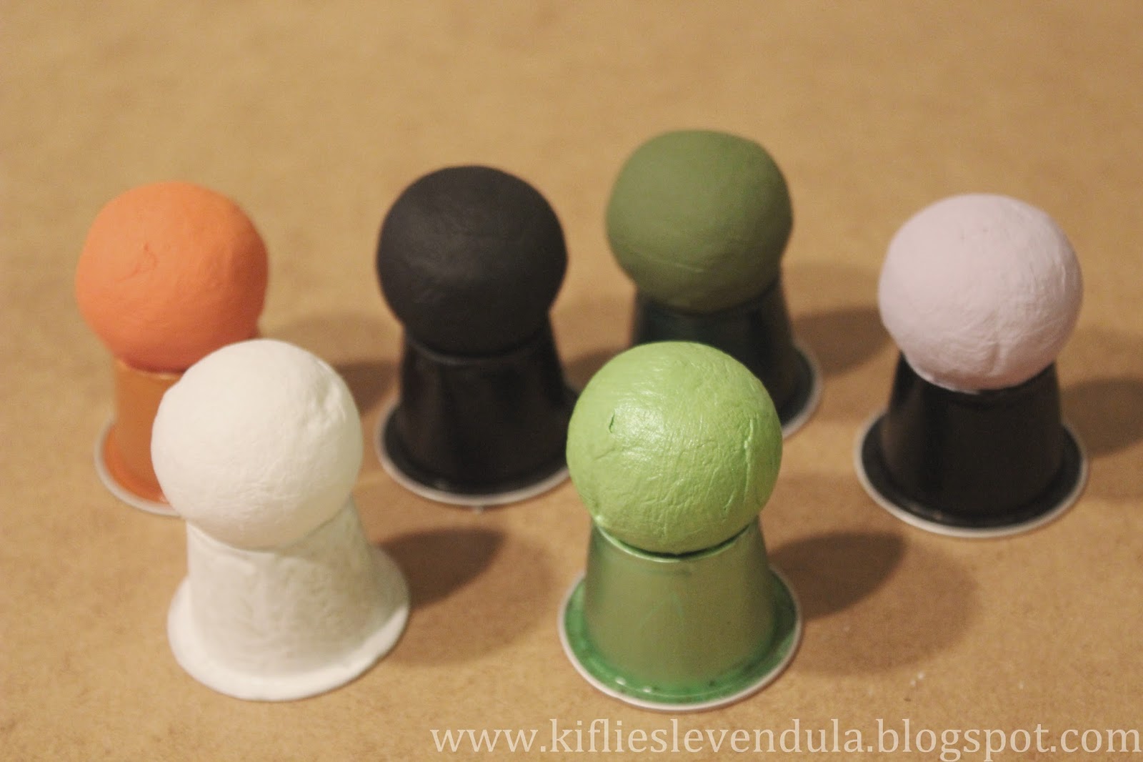 Először is ötleteltünk egy sort, hogy pontosan kiket/miket gyártsunk le - aztán kiválogattunk jó néhányat a kiürített és tisztára törölt kávékapszulákból. A fotó idején még csak öt szereplőben állapodtunk meg, de ez a szám idővel majdnem a duplájára nőtt :-)