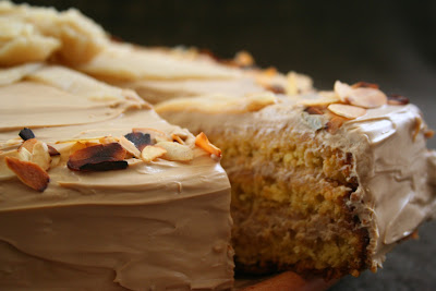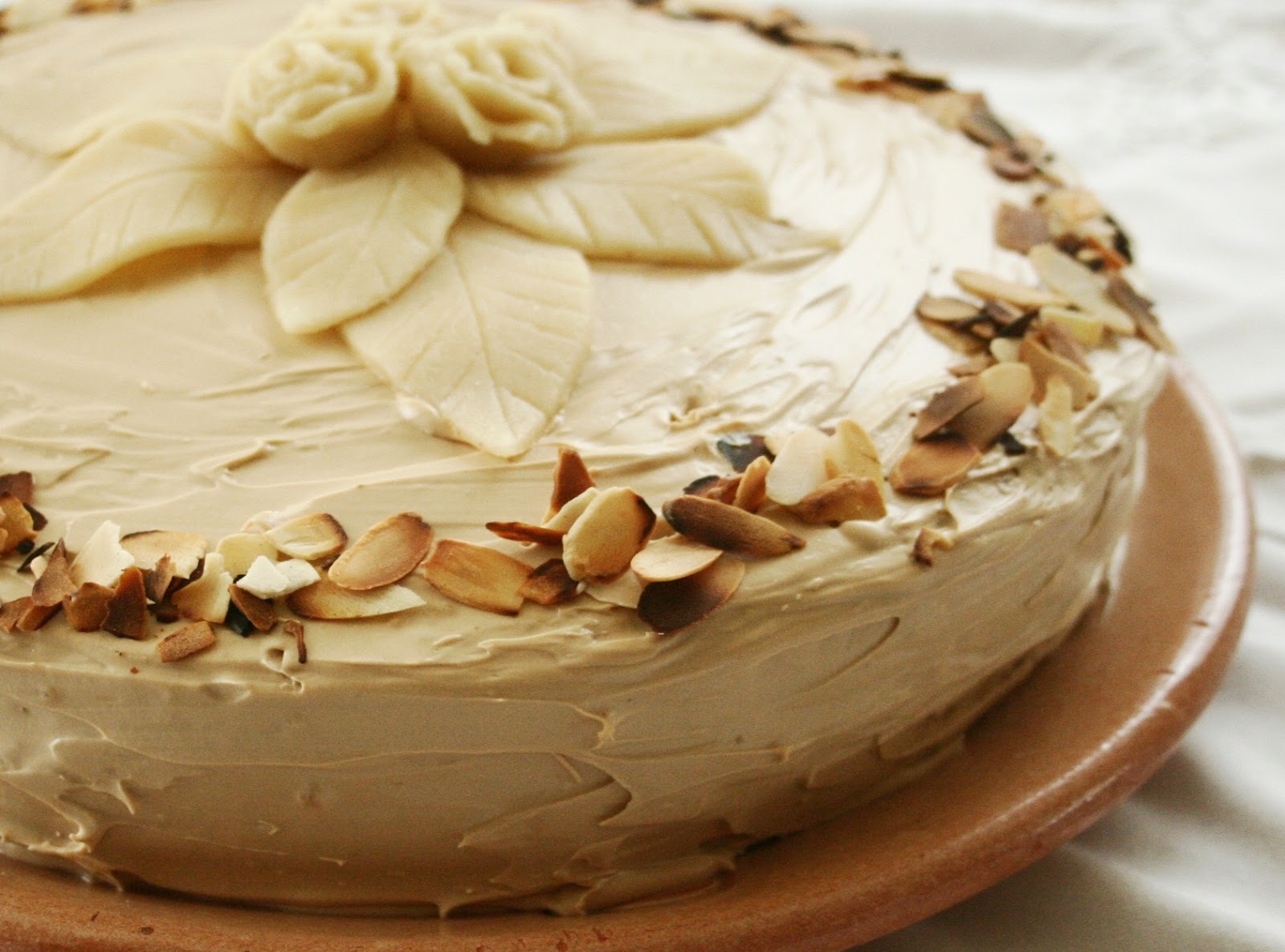 A torta 3 lapját mandulás-vaníliás tésztából sütöttem, a krém pedig egy kávés-mascarponés-amarettós finomság - tényleg olyan finom, hogy simán be lehetne kanalazni egyben az egészet. :-) A tetejére marcipánleveleket és - virágokat készítettem, a szélét pedig pirított mandulával díszítettem.