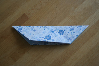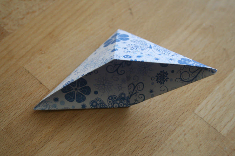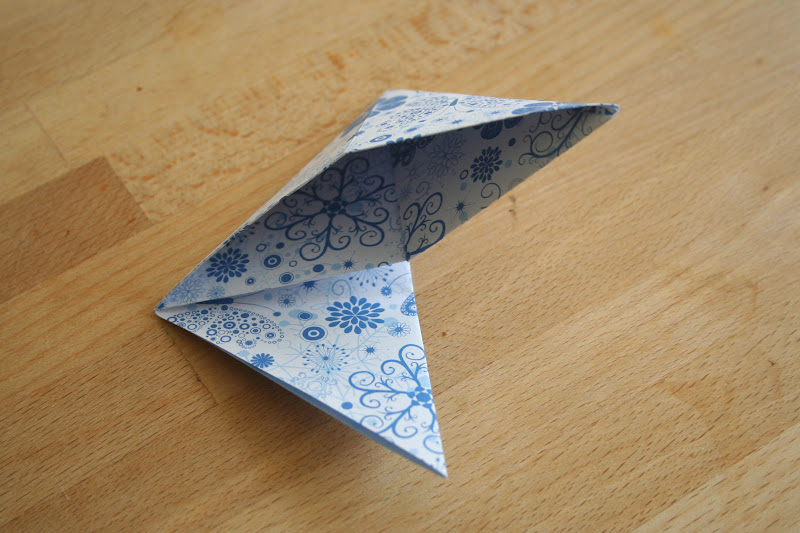 Megfordítjuk, és az egyik fület begyűrjük (behajtjuk) a keletkezett nyílásba:
