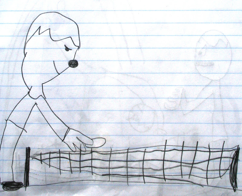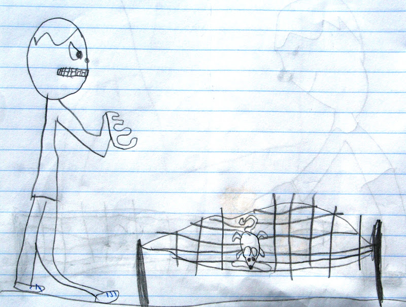A füzetben lévő mesék közül a legnagyobb kedvencem "Az egér" című fejezet, enyhén filozofikus felhangjával és egy kis távoli David Lynch-es beütéssel - néhány nappal ezelőtt ezt is leírtam, úgyhogy következzen most ez a mese, 100 %-ig a hétéves írónő megfogalmazásában, az eredeti rajzokkal :-)