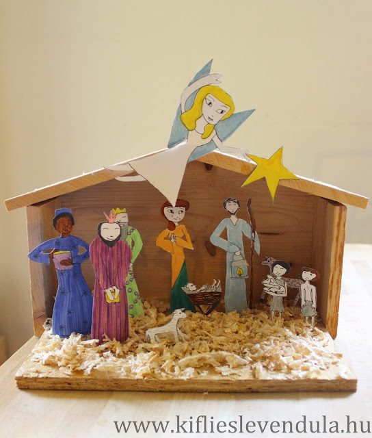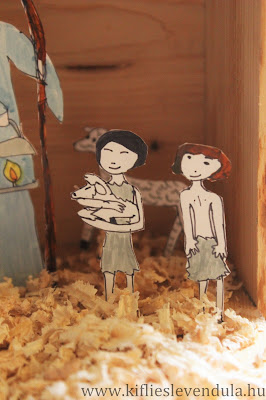 Bár már van egy nagyon szeretett betlehemünk, amit három évvel ezelőtt készítettem, arra gondoltam, idén lehetne egy újabb, ami egészen más, például valamilyen különleges új technikát alkalmazva vagy egyedi megoldásokkal dolgozva. Gondolkoztam, gondolkoztam a dolgon, aztán végül rájöttem, hogyan is lehetne egészen különleges és egyedülálló ez az új betlehem... és adtam a Nagyobbiknak egy kartonlapot, hogy rajzolja erre rá a betlehemi szereplőket, a maga annyira jellemző stílusában - hiszen az ő tízéves kori látásmódját semmilyen technikával vagy alapanyaggal nem tudnám túlszárnyalni, és nem is akarnám soha.