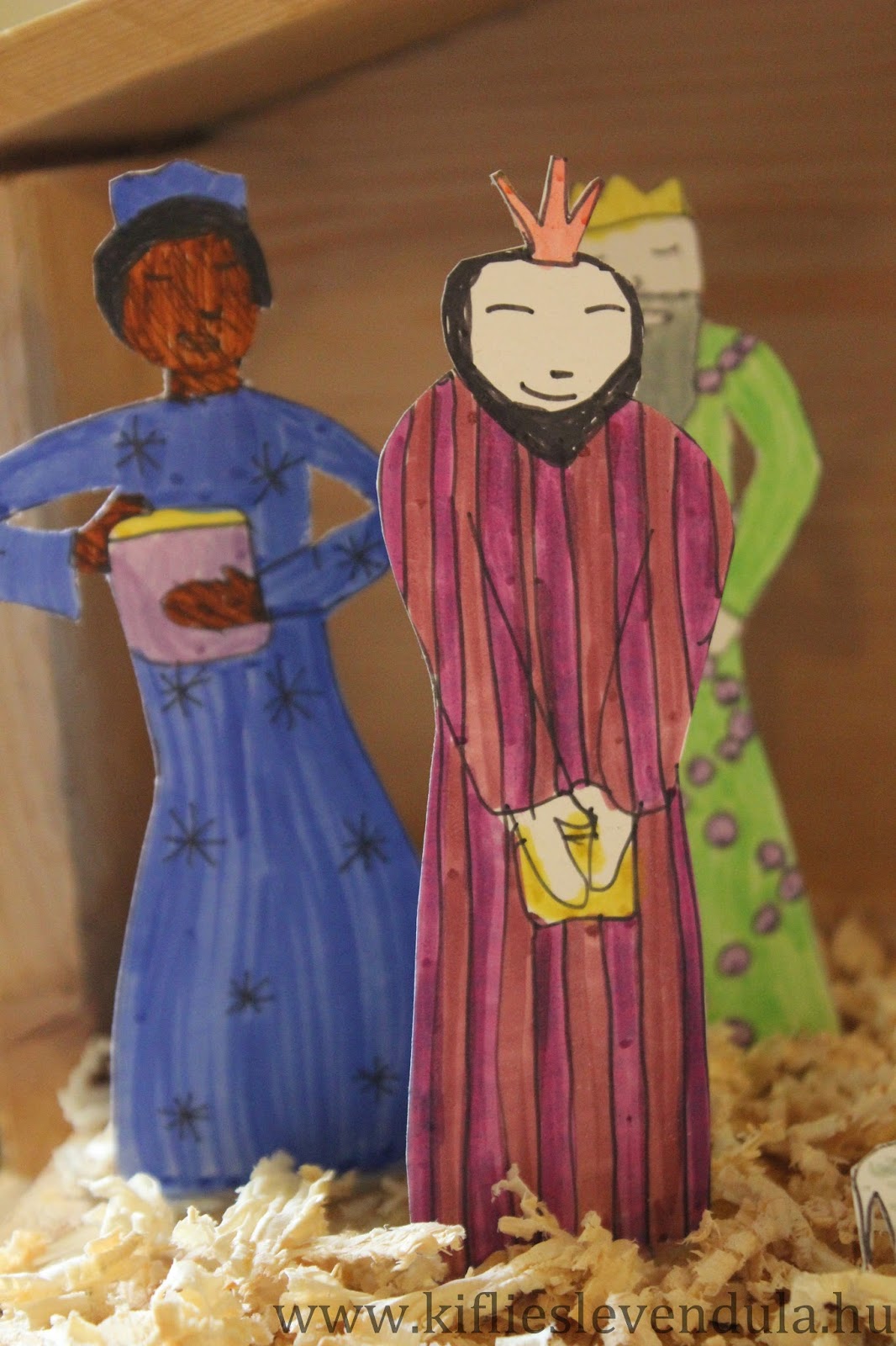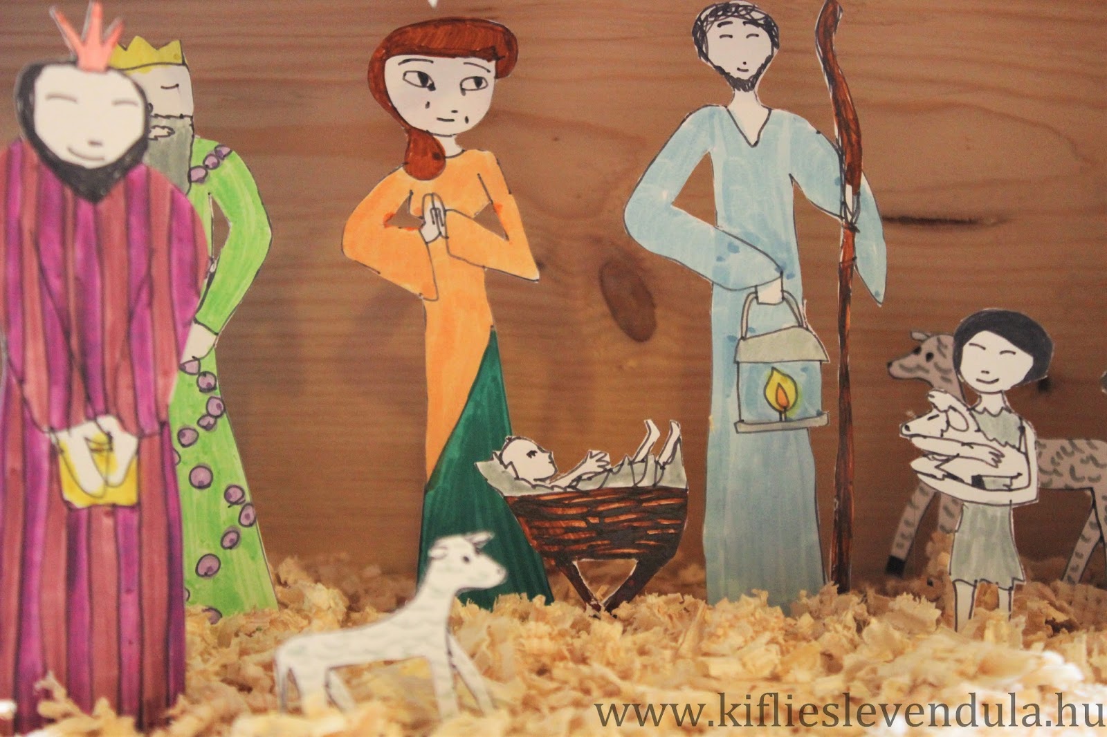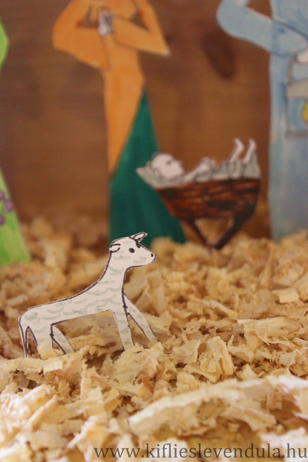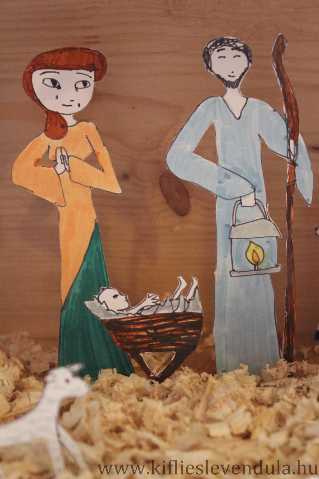 Így az idei betlehemünk az ő rajzaiból állt össze. Amikor befejezte a színezést, kivágtam a figurákat, és egy madáretető faházikóba ragasztottam. Az alapra kevés faforgácsot szórtunk, és mással nem is díszítettük a kis betlehemet - a rajzokban úgyis annyi szeretet és érzés van, hogy bőségesen megtölti a házikót...
