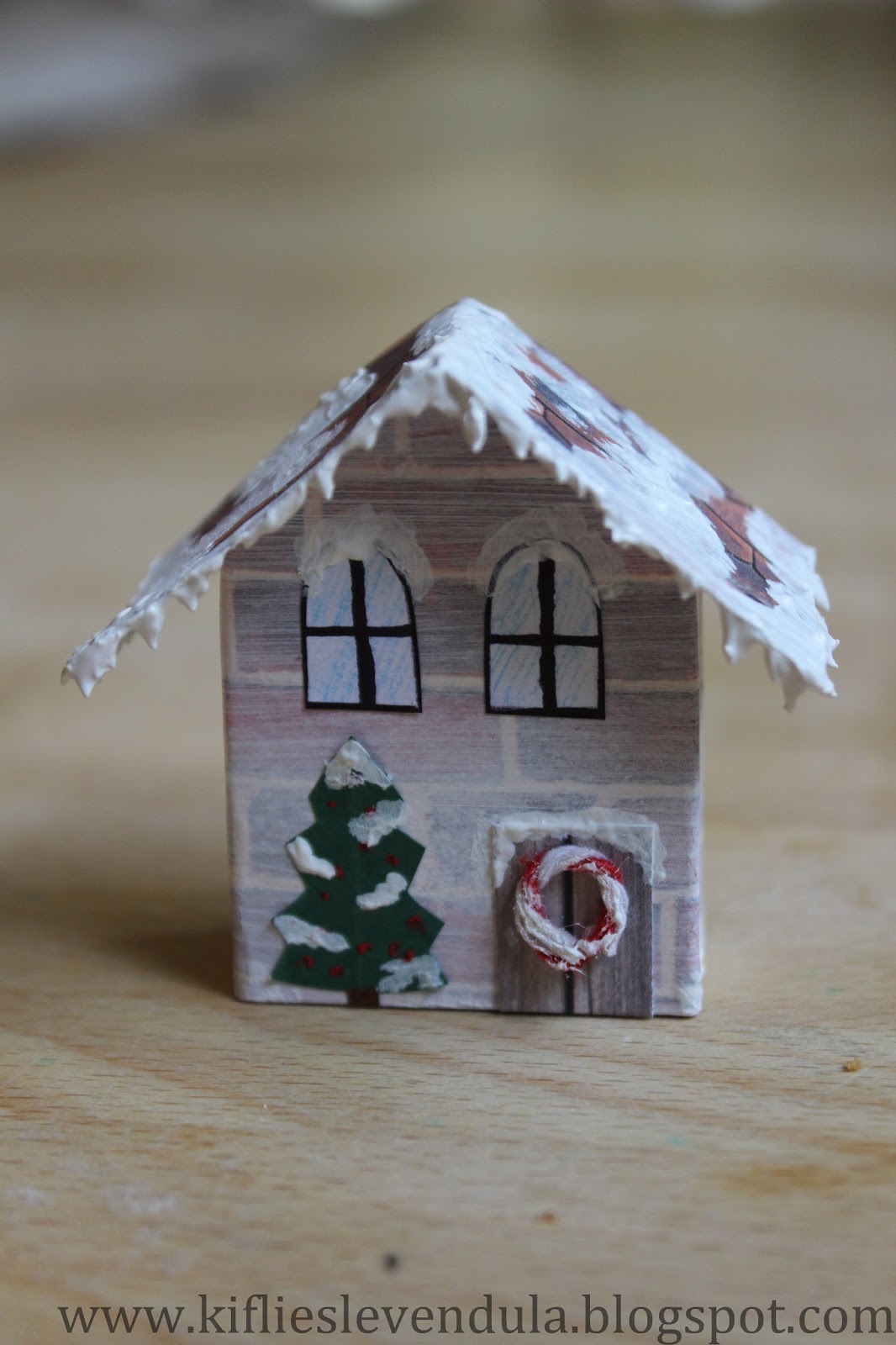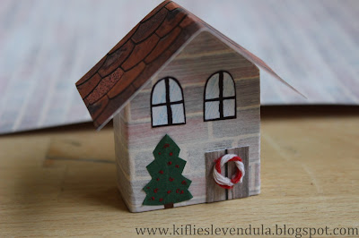Még egyéb apróságot (papírból fenyőfát, pékzsinegből koszorút) ragasztottam a házikóra, majd egy félbehajtott papírcsíkot rögzítettem a tetőrészre.