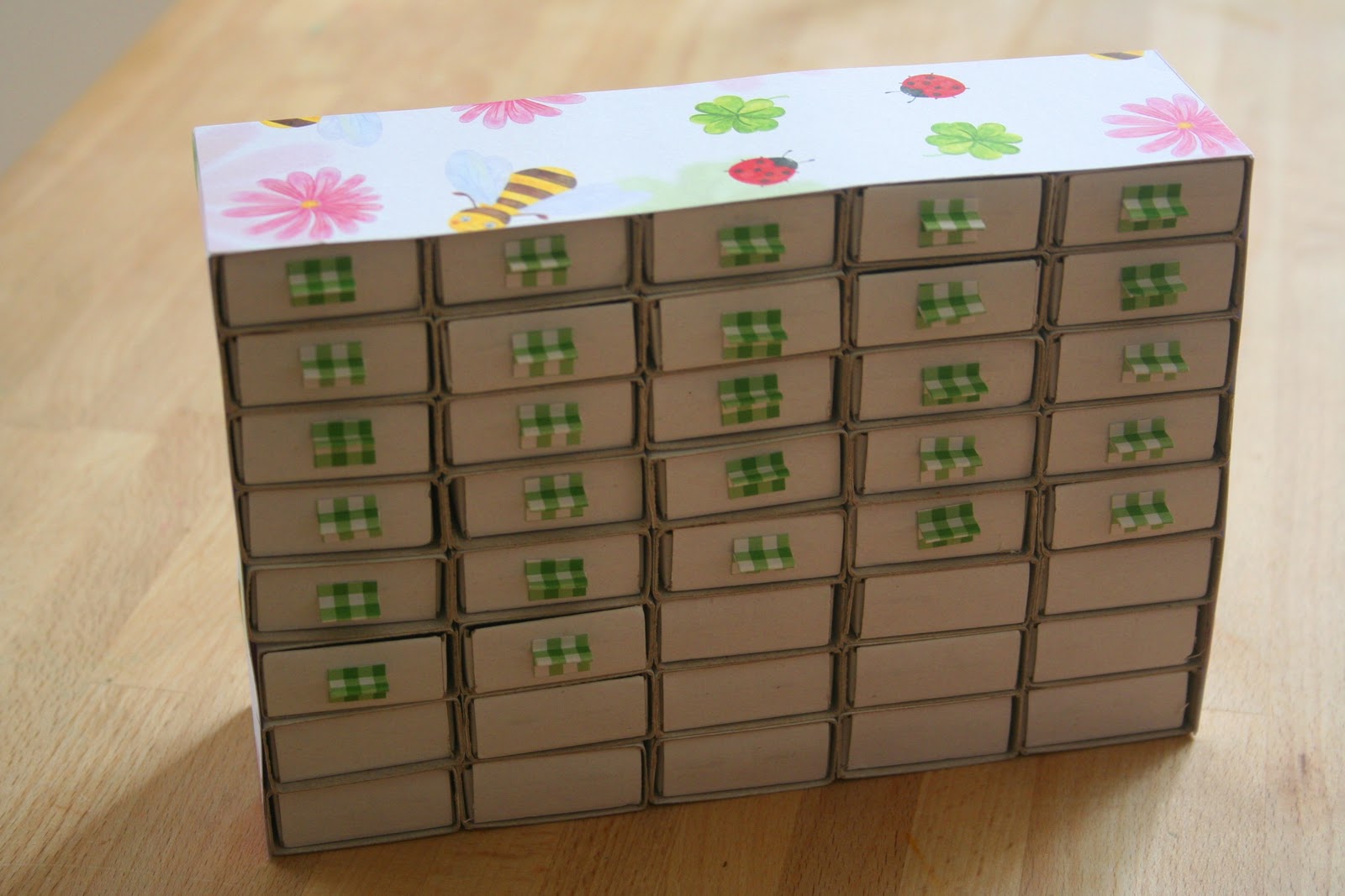 Jól összekeverve visszatettem a fiókokat, és színes papírból kis fogantyúkat ragasztottam rájuk.