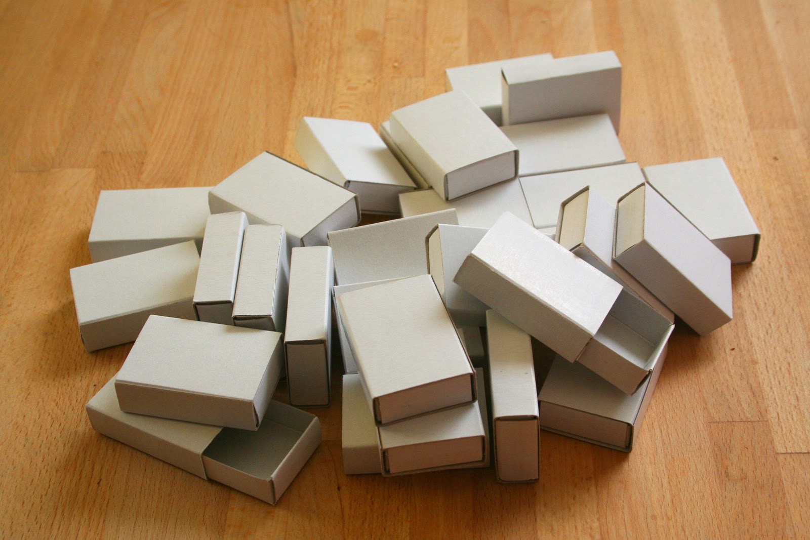 A játék alapanyagát gyufásskatulyák szolgáltatták, de mivel ehető dolgokkal terveztem ezeket megtölteni, nem akartam korábban gyufákat tároló dobozkákat használni, és külön erre a célra vettem tiszta fehér skatulyákat (nagyobb hobbiboltokban kapható), összesen 26 darabot:
