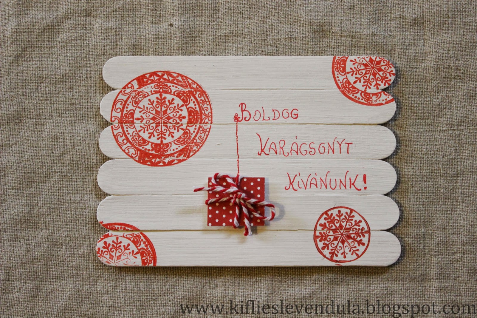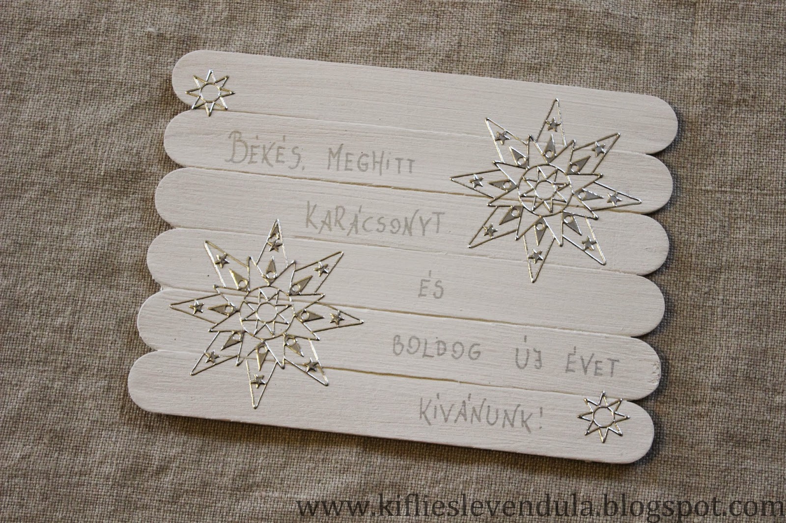 Hát ebből készítettünk négy darabot, különféle egyszerű formákkal - virág, falevél, csillag -, és mi úgy véltük, sikerült kimondottan egyedivé varázsolnunk ezzel az egyszerű képeslapokat.