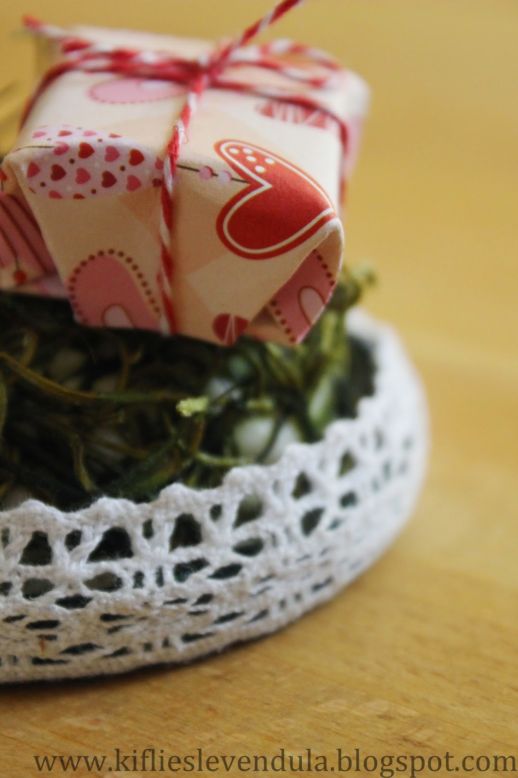 Egy darabka maradék kartonból kivágtam egy szívet, majd az egyik képeslapra helyeztem: