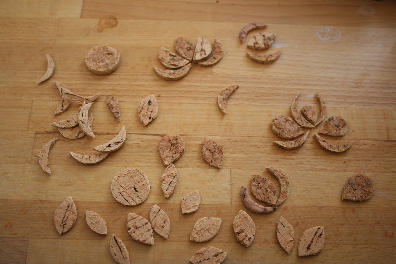 Mindezt azért írtam meg, mert múltkor, egy problémáktól zsúfolt napon álltam a konyhapult mellett, és azzal bíbelődtem, hogy egy parafadugót vágtam nagyon vékony szeletkékre - persze, semmi különös okból, egyszerűen tetszett, hogy a nemrég megélezett késeinkkel mennyire vékony parafaköröket tudok vágni - és akkor jutott eszembe, hogy ebből lehetne készíteni valami olyasmit, ami a mostanában rajtam lévő nép motívumos mániához is jól csatlakozik.