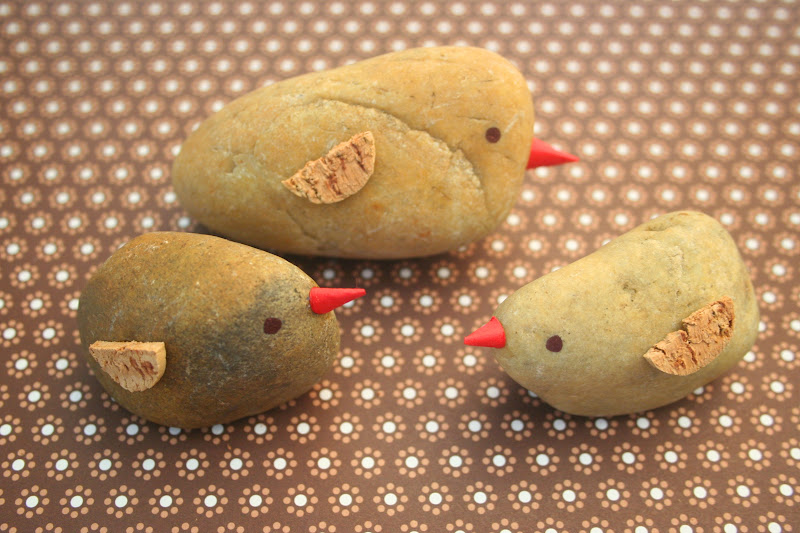 Mindig rájövök, az egész világ egy naaagy inspiráció - hétvégén Nagybörzsönyben jártunk (erről írok majd bővebben, olyan jó volt!), és ott az egyik kertben láttam egy kis kőmadarat. Két börzsönyi lepényevés között el is határoztam, otthon le is gyártok néhány, ehhez hasonló kis szárnyast - persze csak házilagos kivitelezésben, mert sajnos sok egyéb mellett a kőfaragáshoz sem értek :-) De ez nem csökkentette a lelkesedésemet, úgyhogy gyűjtöttem az utcánkban három világosabb színű követ, és öt perc alatt elkészítettem a madártriót.