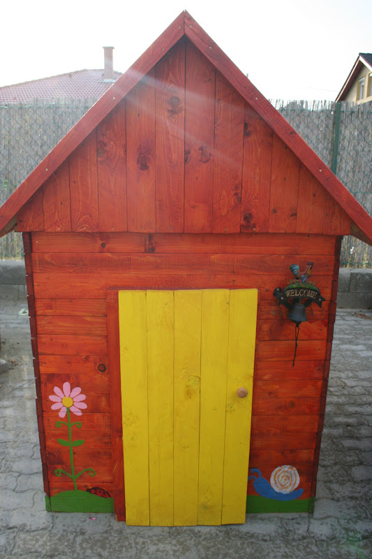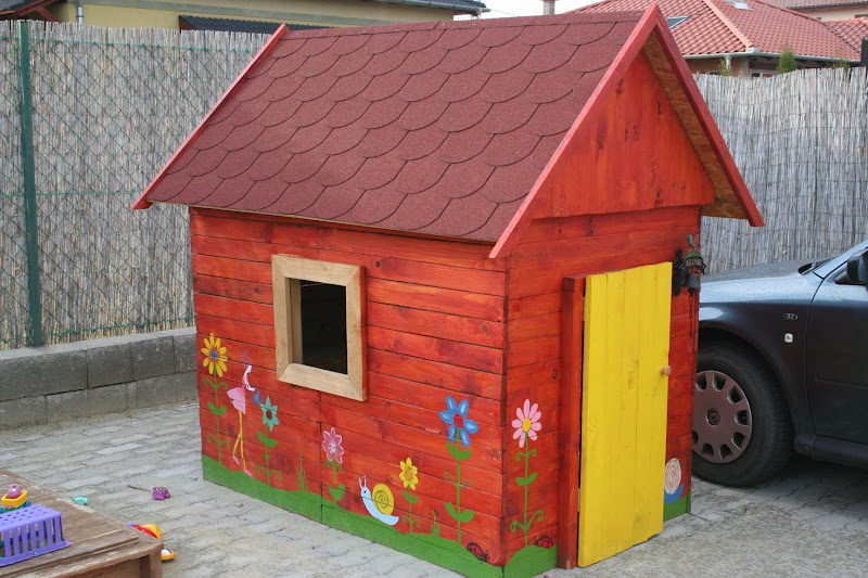 Két hétvégén át fúrtunk-faragtunk-fűrészeltünk kitartóan, egy harmadik hétvégét pedig a festéssel töltöttünk el, de számunkra is hihetetlen módon egyszercsak kibontakozott a kezünk alól a megálmodott kisház. Nem mondom, egy kicsit ferdék a falai, de már akkor is három éve, hogy itt áll a kertünkben, és valami óriási büszkeség, hogy mi ketten hoztuk létre.