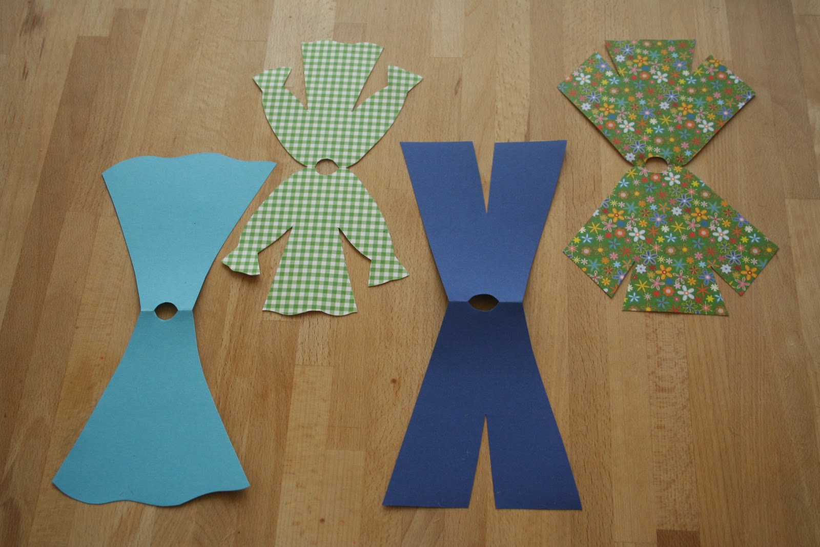 Elkészítettem a ruhájukat is a képen látható módon: a lényeg, hogy két ugyanolyan darabból álljanak, középen érintkezve, és vágjuk ki a lyukat a fakanál nyelének.