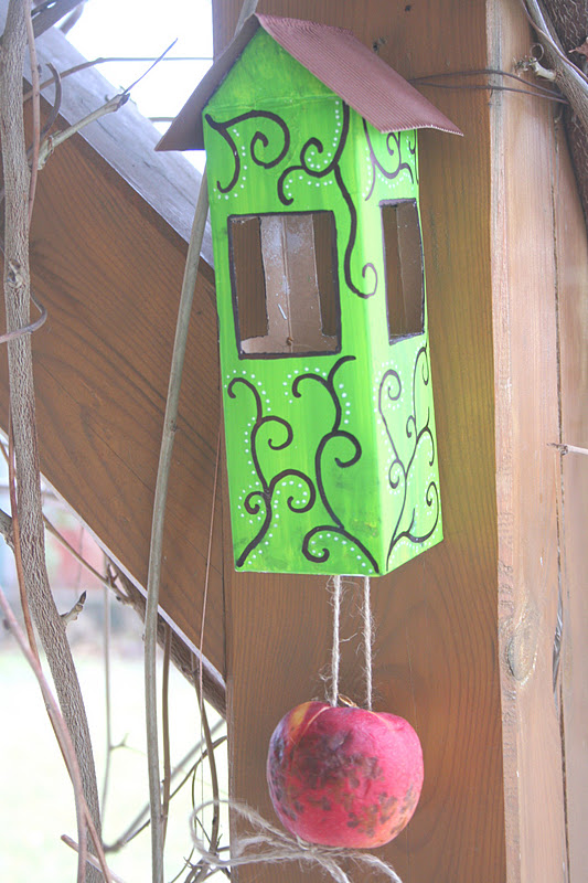 Végül a doboz hátuljára fúrtam egy lyukat (a rögzítéshez), az aljára pedig két másikat, amelyeken átvezettem egy spárgát, és ráakasztottam egy almát. :-)