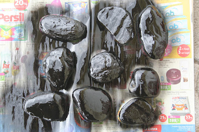 Nálunk fontos adalék, hogy a Kisebbik nagy kőrajongó - ahol lát egy formás kavicsot, azt nyomban begyűjti. Arra gondoltam, most próbálom álcázni a köveket, és ezért fekete akrilfestékkel lefújtam őket - reményeim szerint így kevésbé lehet majd őket észrevenni majd a földek felszínén. :-)