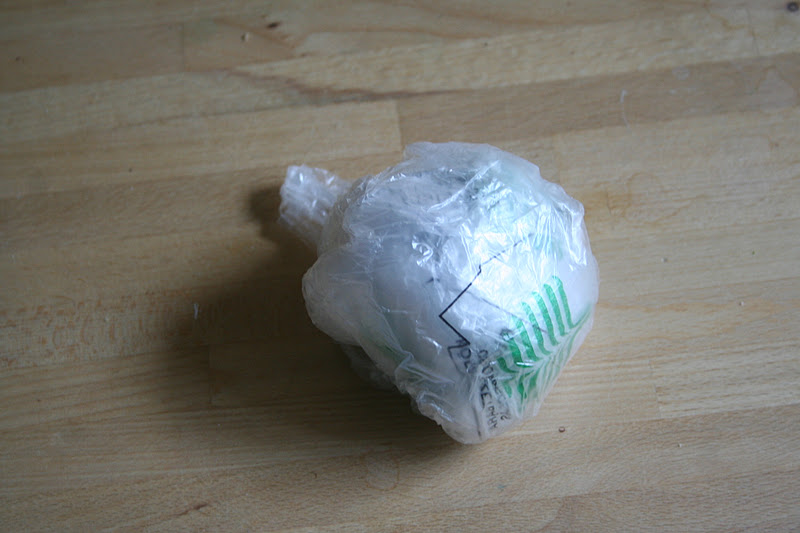Az egyik zacskót összegyűrtem gombócba, és becsomagoltam a másikba úgy, hogy nagyjából gömbölyű legyen a kapott forma: