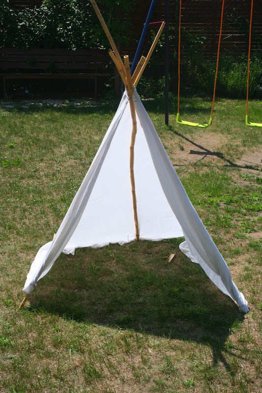 Így tettem szert néhány csodaszép nádszárra, és hamarosan beigazolódott, hogy tényleg jó lesz valamire... mert amikor a Nagyobbik egy hétvégén indiános hangulatában volt, fogtam a nádszárakat, néhány vastag, erősebb befőttesgumit, pár nagyobb ruhacsipeszt, valamint egy kétszemélyes lepedőt, és pontosan öt perc alatt máris a kertben állt a hevenyészett sátor. Ahogy a bevezetőben is írtam, nem volt benne semmi extra, nem spéciztem fel semmivel, egyszerűen csak egy sima sátor volt - de a kicsik nem így látták, és azt hiszem, ez a legfontosabb. Repülő Tündérkéz és Kéktérdű Izommancs, a híres-hírhedt indiánok máris elfoglalták a sátrat, és bár róluk ezúttal sincs kép, mohikáneskü alatt vallom, nagyon jól érezték magukat benne. :-)