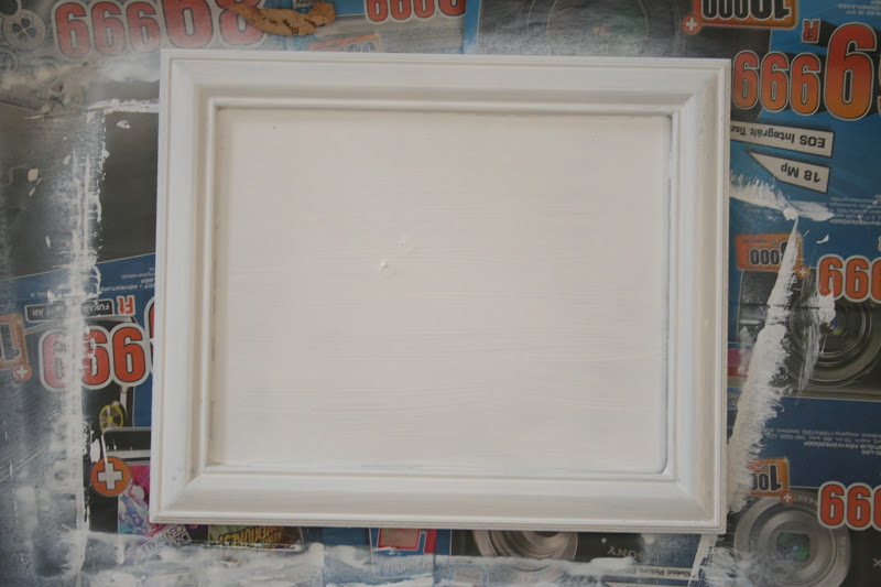 Aztán fogtam a kékséges keretet, kivettem belőle az üveget, és ecsettel és fehér alapozó akrilfestékkel átfestettem a keretet és a hátlapot fehérre, majd száradás után át is fújtam az egészet fehér akrilspray-vel.