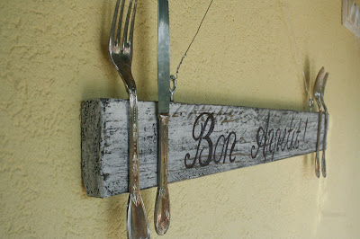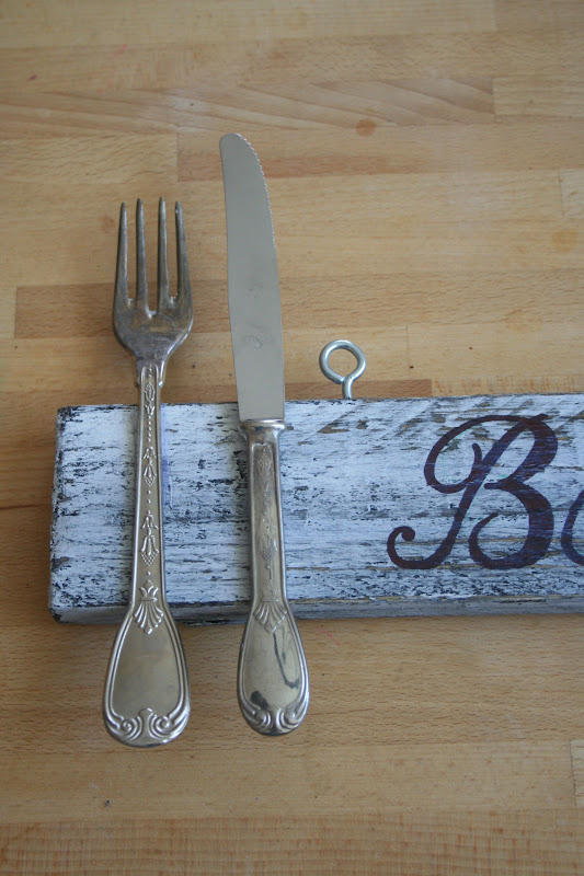 A deszka tetejébe belecsavartam két fémkampót - vagy valami hasonlót, nem tudom a barkácsterminológiát :-) . A deszka két végére ragasztópisztollyal néhány evőeszközt rögzítettem: