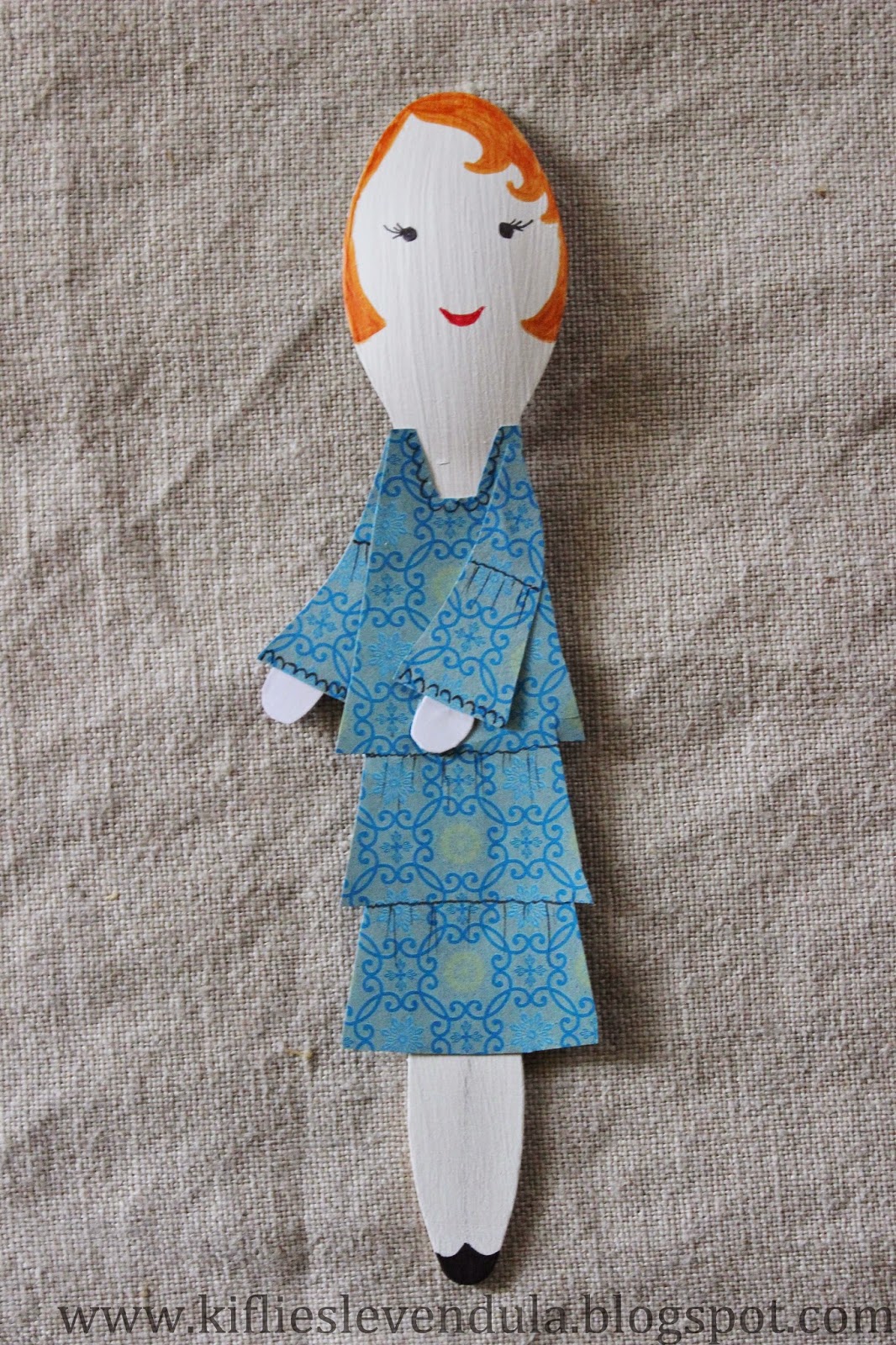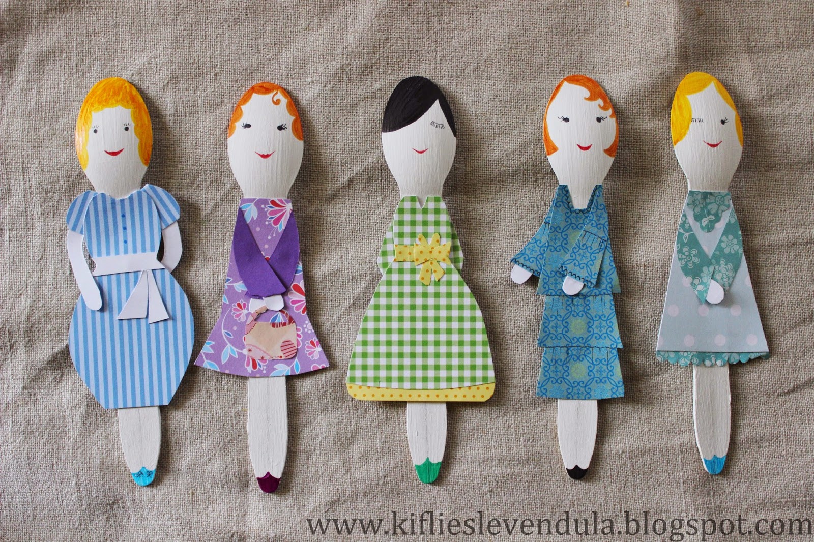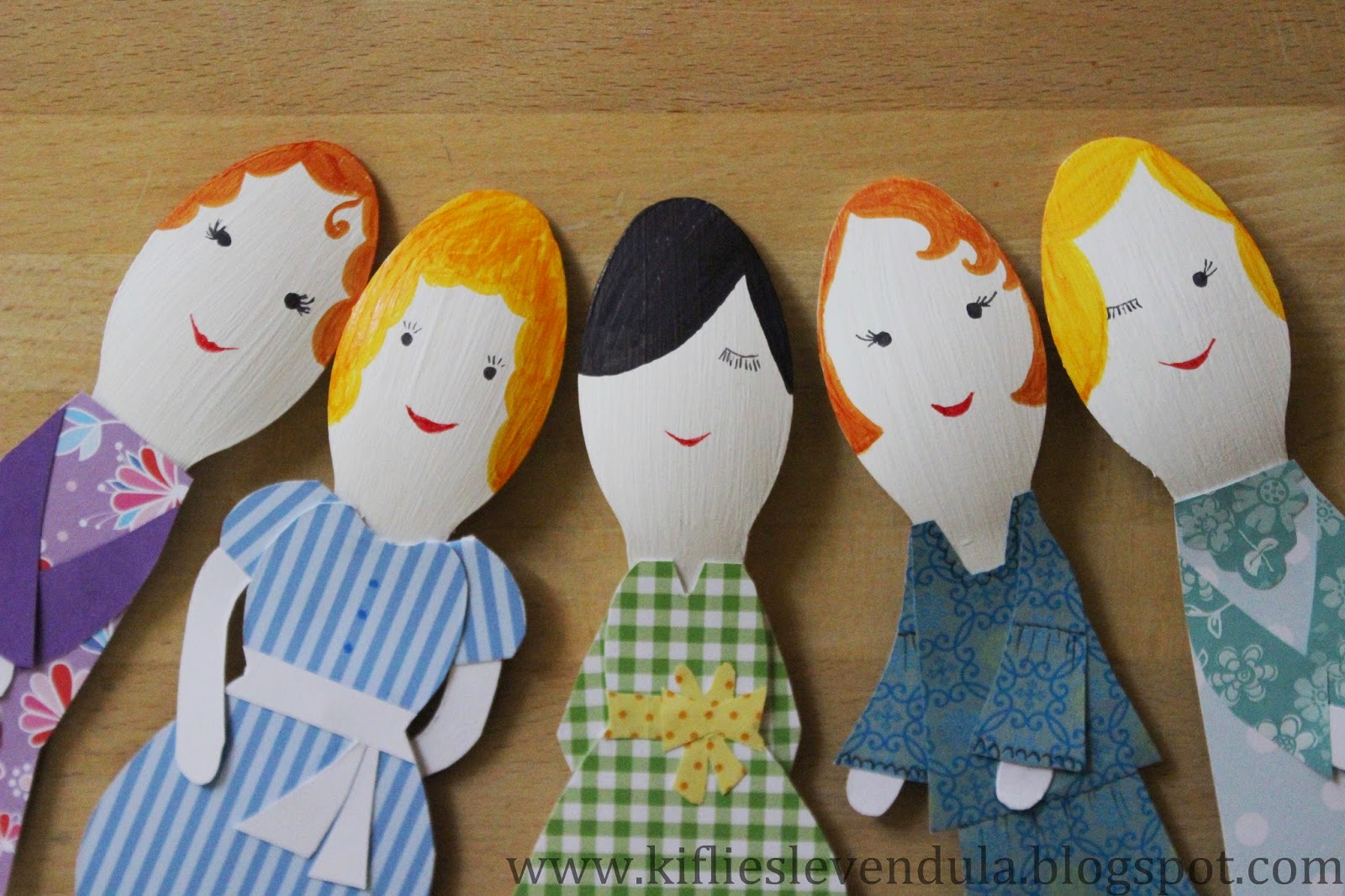Hazaérkezvén aztán mondanom sem kell, az extraszuper ötletek egyike sem jutott már az eszembe, és ez azóta is így volt. A szépséges natúr fakanalakat persze nagy becsben tartottam (igaz, azóta már itthon is láttam ilyeneket...), de azon kívül, hogy a port néha lefújtam róluk, mást nem kezdtem velük. Már azon gondolkodtam, a következő gyerekbulin elhasználom arra, amire minden bizonnyal tervezték őket, de aztán egy borús, hangulatlenyomó napon dacosan arra gondoltam, mi lenne, ha csak úgy készítenék belőlük valamit, egyszerűen csak saját magam felvidítására - néha ilyen is kell :-) A tervet megosztottam a Nagyobbikkal is, aki erre lelkesen kijelentette, hogy akkor majd ő megmondja, mi legyen a kanalakból - úgyhogy végül divatbabákat gyártottam belőlük, a kis mini múzsa iránymutatásai szerint készült papírruhákkal. Abszolút haszontalanul, minden előzetes tervezéstől mentesen - de nem kell mindig megváltani a világot, igaz? :-)