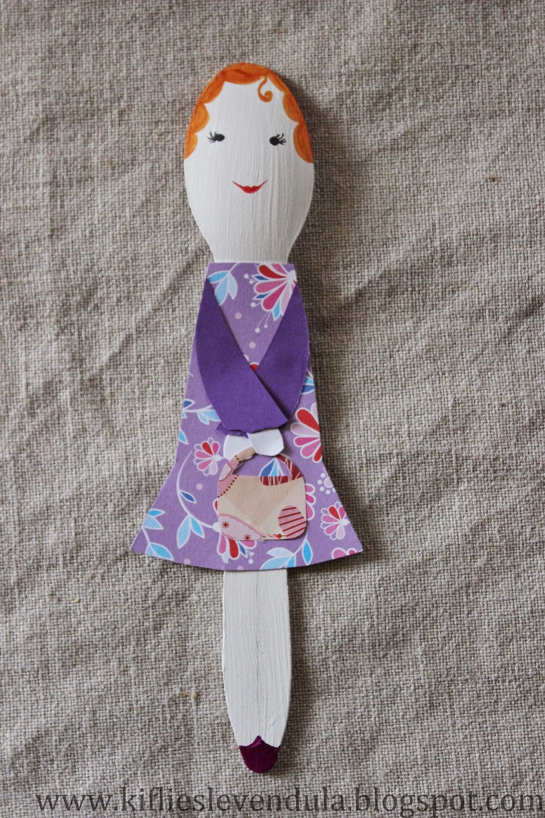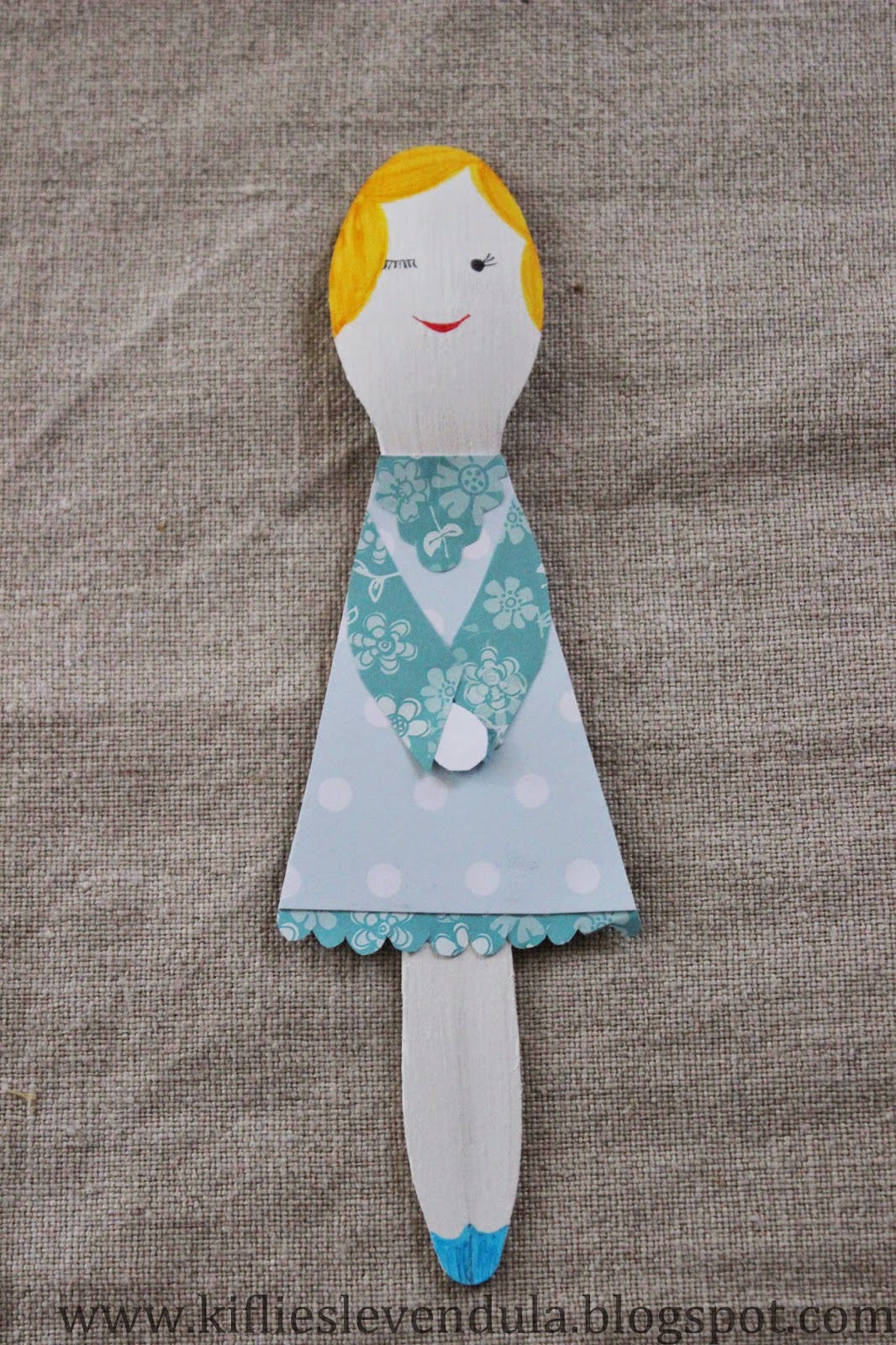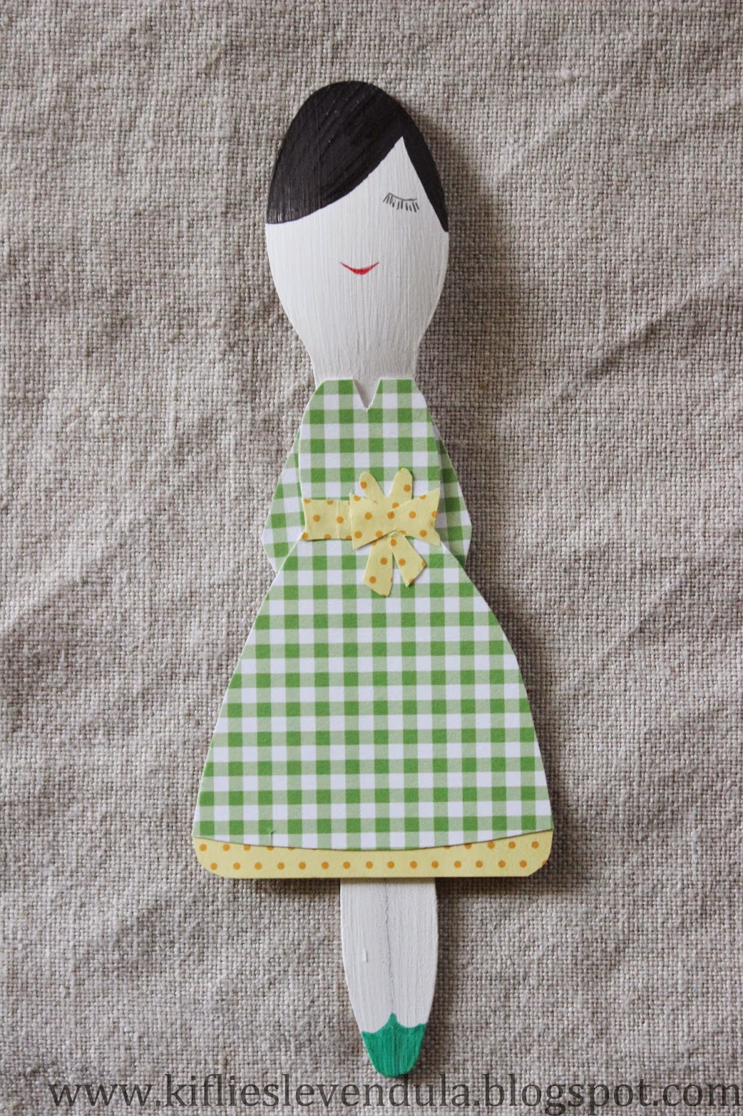 Hazaérkezvén aztán mondanom sem kell, az extraszuper ötletek egyike sem jutott már az eszembe, és ez azóta is így volt. A szépséges natúr fakanalakat persze nagy becsben tartottam (igaz, azóta már itthon is láttam ilyeneket...), de azon kívül, hogy a port néha lefújtam róluk, mást nem kezdtem velük. Már azon gondolkodtam, a következő gyerekbulin elhasználom arra, amire minden bizonnyal tervezték őket, de aztán egy borús, hangulatlenyomó napon dacosan arra gondoltam, mi lenne, ha csak úgy készítenék belőlük valamit, egyszerűen csak saját magam felvidítására - néha ilyen is kell :-) A tervet megosztottam a Nagyobbikkal is, aki erre lelkesen kijelentette, hogy akkor majd ő megmondja, mi legyen a kanalakból - úgyhogy végül divatbabákat gyártottam belőlük, a kis mini múzsa iránymutatásai szerint készült papírruhákkal. Abszolút haszontalanul, minden előzetes tervezéstől mentesen - de nem kell mindig megváltani a világot, igaz? :-)