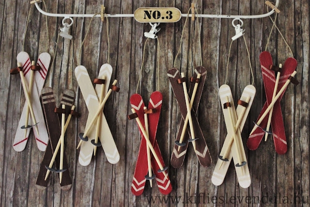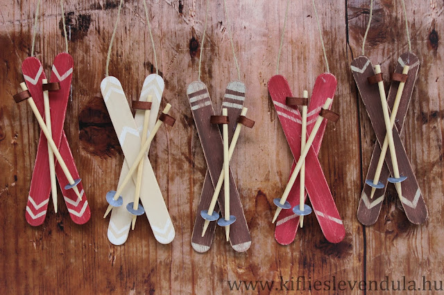 Így aztán amikor eszembe jutott, hogy de jó lenne síléctémában barkácsolni, rögtön tudtam, hogy csak olyanok lesznek, amiket rendes méretben szívesen felcsatolnék... aztán eltelt vagy három év, mert nem jutott eszembe semmilyen alapanyag, amiből egyszerűen meg lehetett volna valósítani a dolgot. Most viszont csak rá kellett néznem a gyógyszertári faspatulákra, és rögtön tudtam, hogy ez az... persze ha szigorúan nézem, arányaikban nem annyira sílécesek, de kicsire nem adunk :-) Ráadásul épp nemrég kaptam egy csomag saslikpálcát, amiről már akkor tudtam, hogy biztosan nem saslikozni fogok velük - viszont síbotnak egészen pompásak.