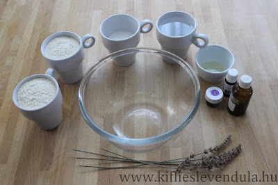 - levendulaolaj (100 %-os) - ebből 100 cseppet használtam (kb. a 10 ml-es üvegecske egyharmadát), de lehet többet is, ha még intenzívebb illatot szeretnétek