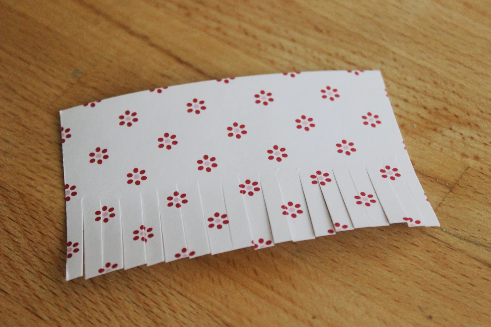 A szoknyához mintás papírból olyan hosszú csíkot vágtam, amit nagyjából háromszor a csipesz köré tudtam tekerni, és hosszában nyílásokat vágtam rá.