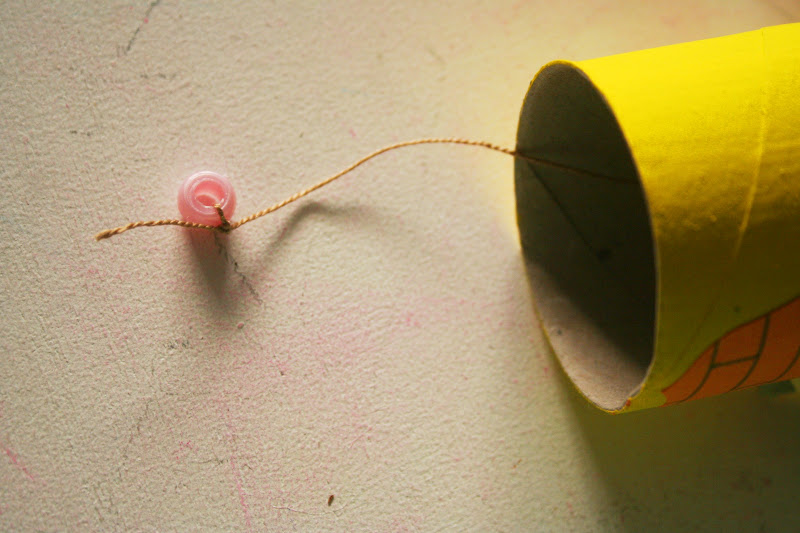 Jöhetett a felakasztás: egy fonalat átvezettem a papírtölcsérek tetején, alul pedig kötöttem rá egy gyöngyöt, hogy biztosan ne csússzon ki felakasztáskor.