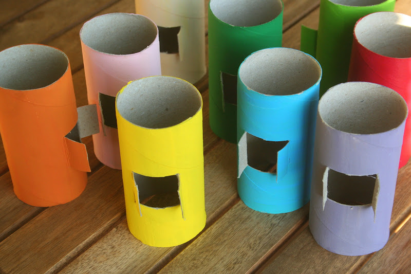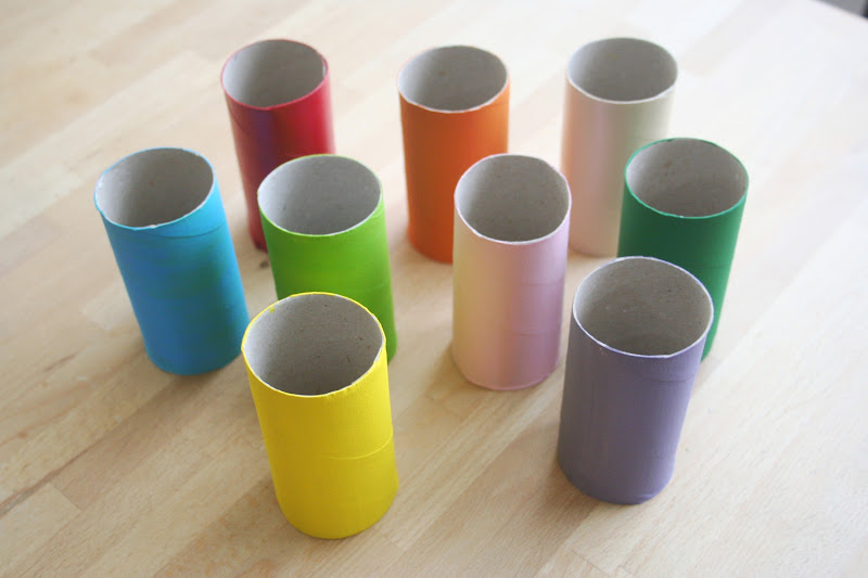 Először is fogtam jó néhány darab vécépapír-gurigát, és lefestettem őket különböző színűekre.