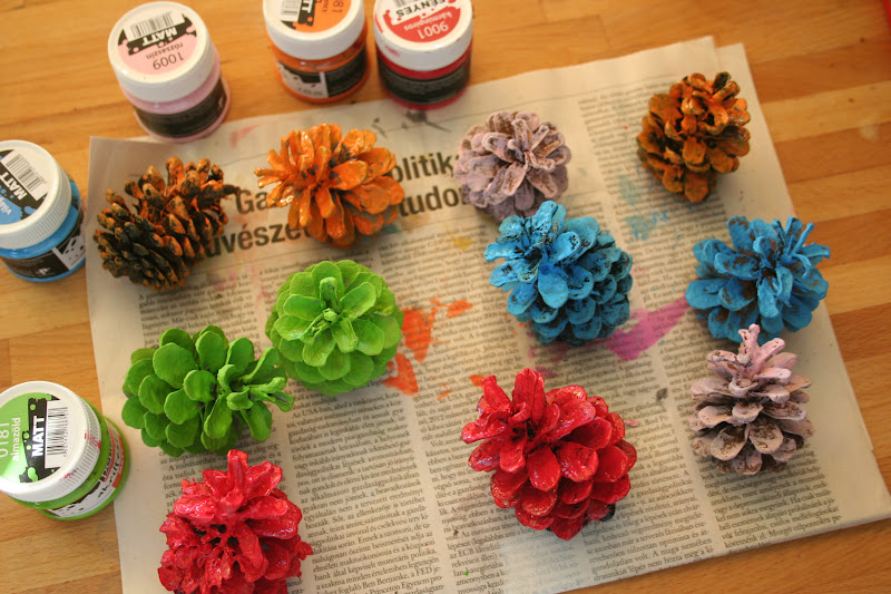 Akrilfestékkel befestettük, ki-ki képességei szerint - ezért aztán a tobozok egy része inkább foltos lett, mint színes, de szerintem ez így kimondottan jól nézett ki. :-)
