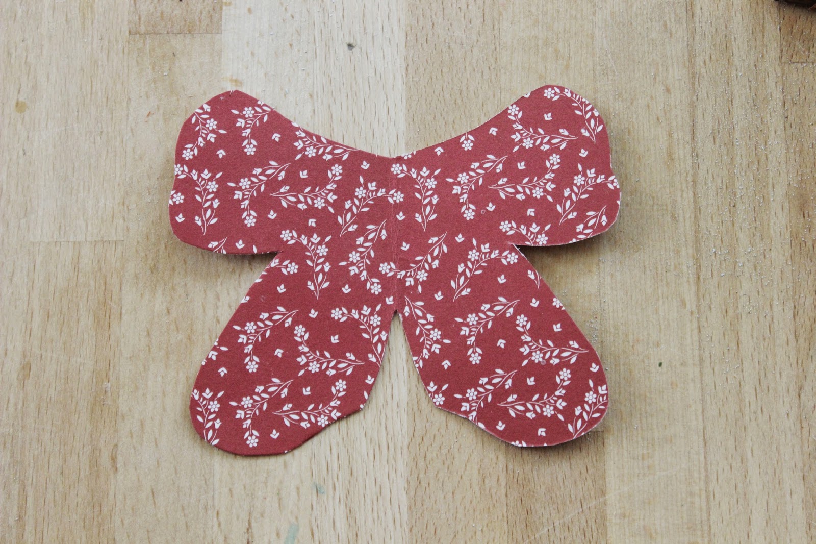 A szárnyat kettéhajtott mintás papírból vágtam ki. A szárny közepét beragasztóztam, rátettem egy cérnahurok végét (hogy majd fel lehessen akasztani), és a szárnyat a csipesz hátuljára ragasztottam.