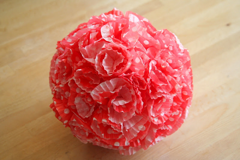 Nemrég arra jutottam, legalább a kedvencemet, a piros-fehér pöttyöset nem fogom tovább kímélni. Miután a neten sok helyen láttam muffinpapírból készült koszorúkat, én is úgy gondoltam, valamilyen dekorációt készítek ezekből a színes-mintás papírkelyhekből, viszont mindenképpen fellógatható tárgyat szerettem volna - úgyhogy ehhez egy hungarocell gömbre volt szükségem, meg persze a ragasztópisztolyomra.