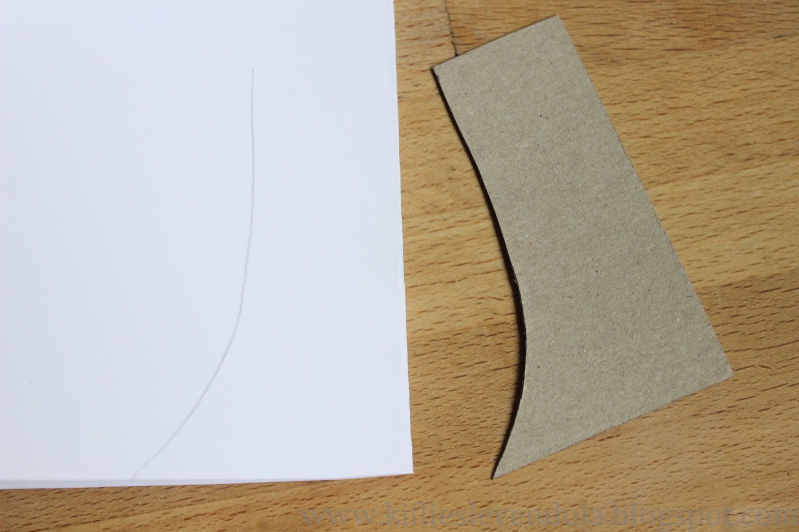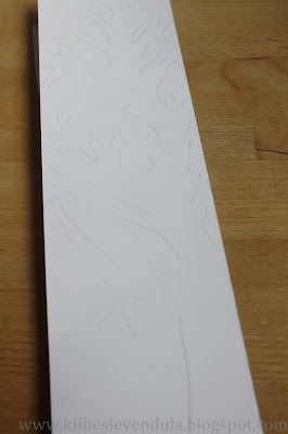 Mivel a fák összeállításánál fontos, hogy a törzsük ugyanolyan legyen, kartonból vágtam egy sablont ehhez, amit a hajtásvonal alsó részéhez helyezve át is rajzoltam:
