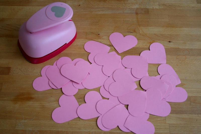Fogtam két rózsaszínű A/3-as kartont, és a szív-mintás lyukasztómmal kivágtam belőlük sok-sok szép szívet (5-7 cm-eseket vág a lyukasztó).