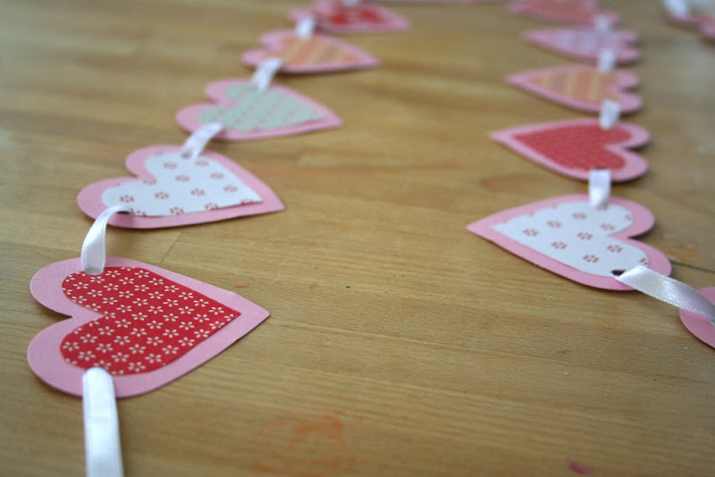 Egy teljesen sima irodai lyukasztóval egy-egy nyílást lyukasztottam a szívek szélére, és felfűztem őket egy fehér selyemszalagra, egymástól kb. egy cm távolságra.