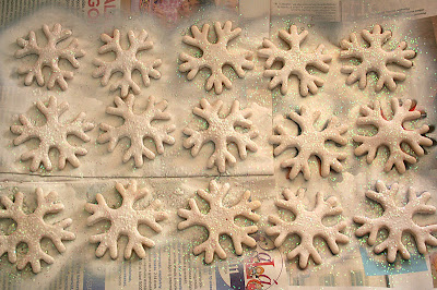 Ezután pedig csak annyi van hátra, hogy rákössünk a hópelyhekre fehér cérnát a felakasztáshoz - és készen is van. Én pedig most először éreztem azt, hogy a só-liszt gyurma mint alapanyag túlságosan le van becsülve - mert amiből ilyen egyszerűen szépet lehet készíteni, az sokkal több figyelmet érdemel...