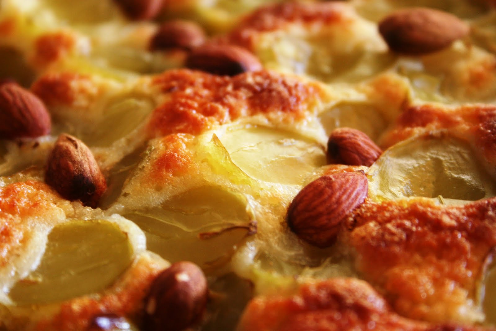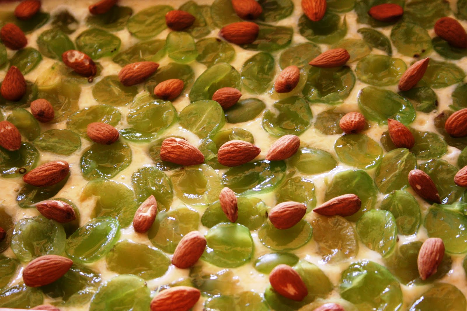 Pár napja úgy adódott, hogy sok-sok szőlő gyűlt fel nálunk, vettünk és kaptunk is. Gondoltam, ne vesszen kárba semmiképp, hát sütök valami szőlős sütit. Körbenéztem a neten, hátha találok valami igazán jó szőlős receptet, de akkor éppen eggyel sem találkoztam, ami olyan lett volna, amilyet én elképzeltem: semmi krém, semmi fakszni, csak a tésztába belesült szőlőszemek. Nos, gondoltam, ha nincs ilyen - akkor is megsütöm. Felidéztem magamban a sokak által jól ismert, egyszerű joghurtos kevert tészta összetevőit, és pár perc alatt össze is dolgoztam a hozzávalókat. A tetejét teleraktam a kövér, mosolygósan zöld szőlőszemekkel, alaposan megszórtam egész mandulával, és megsütöttem.